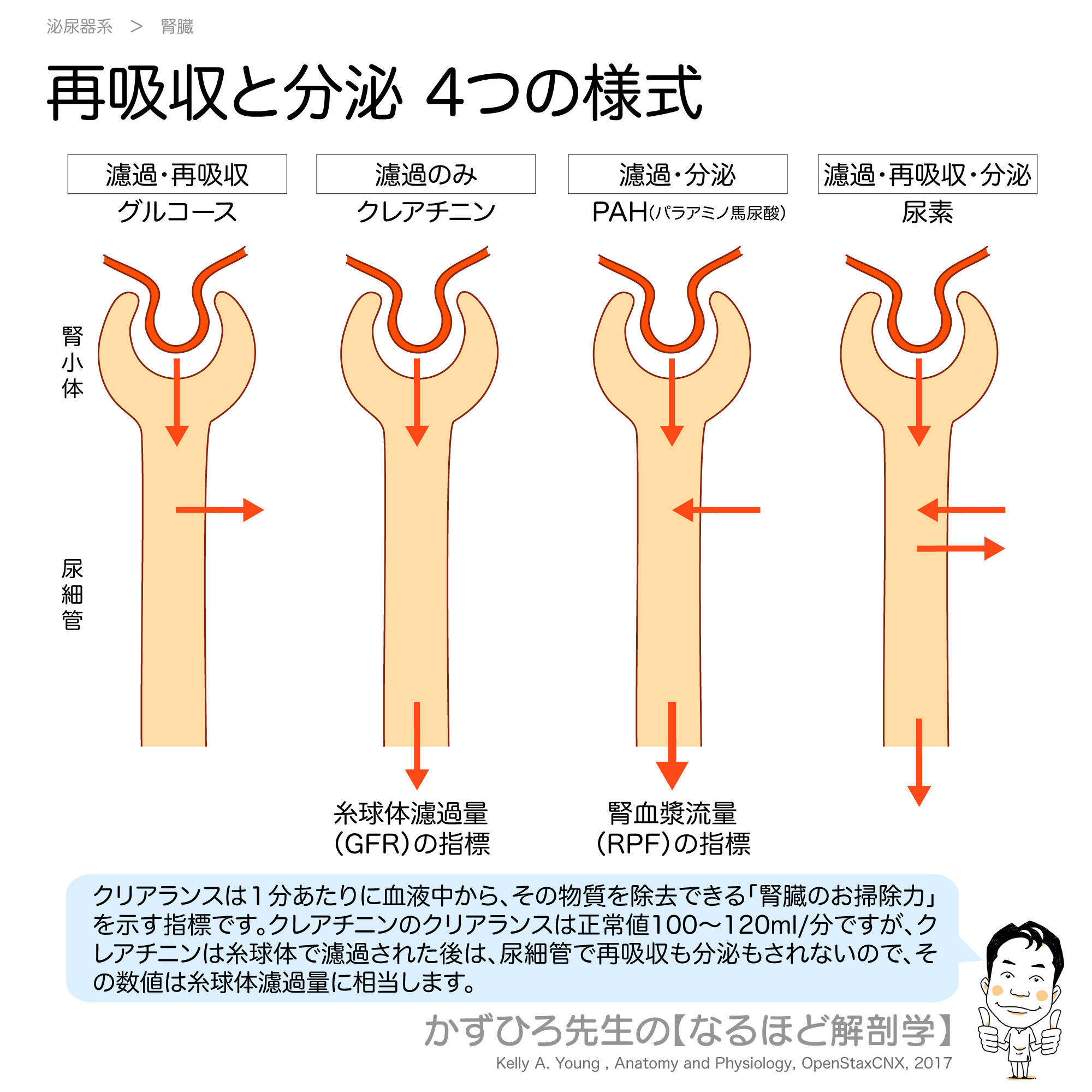| 濾過のみ | クレアチニン | 糸球体で濾過されるが、再吸収も分泌もされない | 糸球体濾過量(GFR)の指標 |