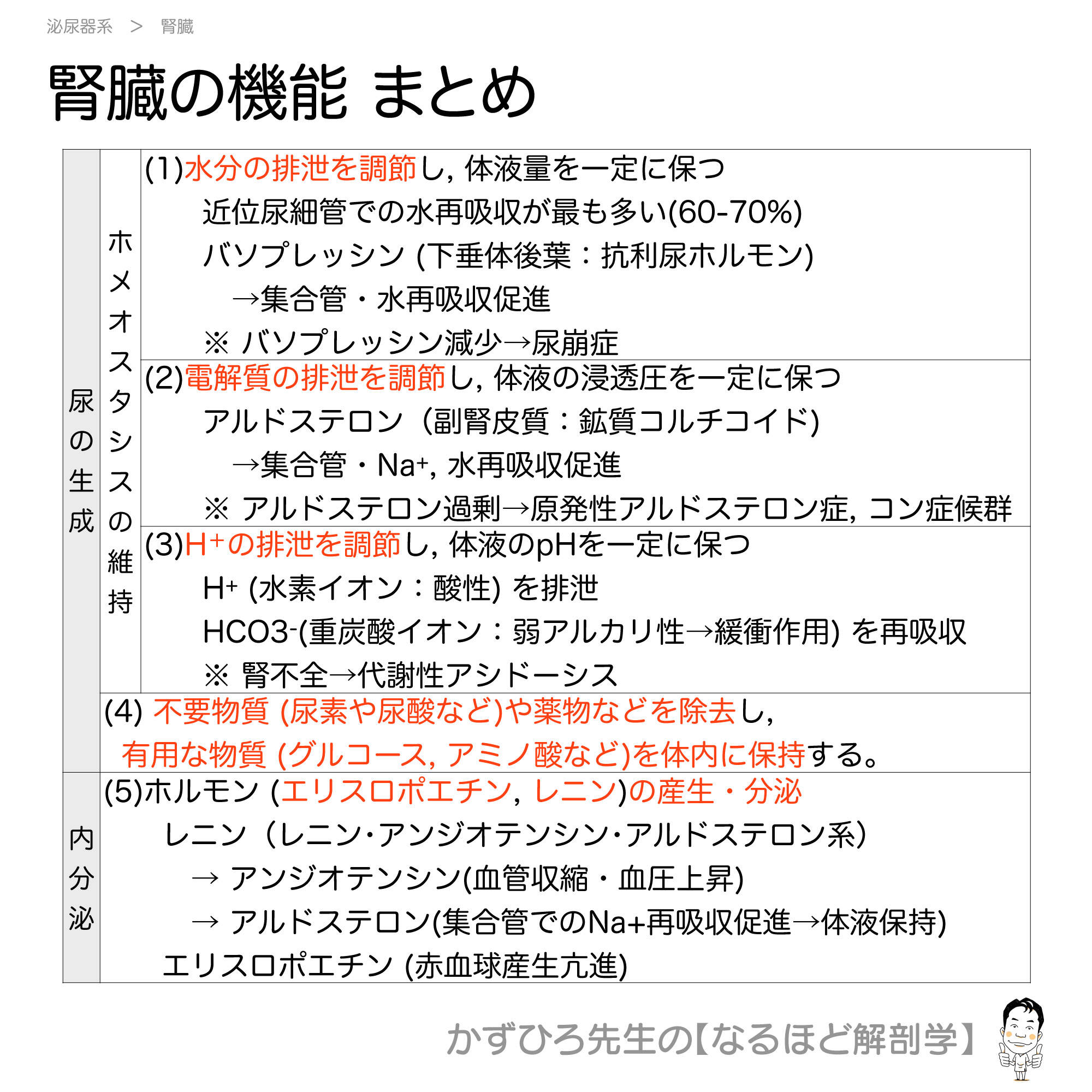 腎臓の機能まとめ表