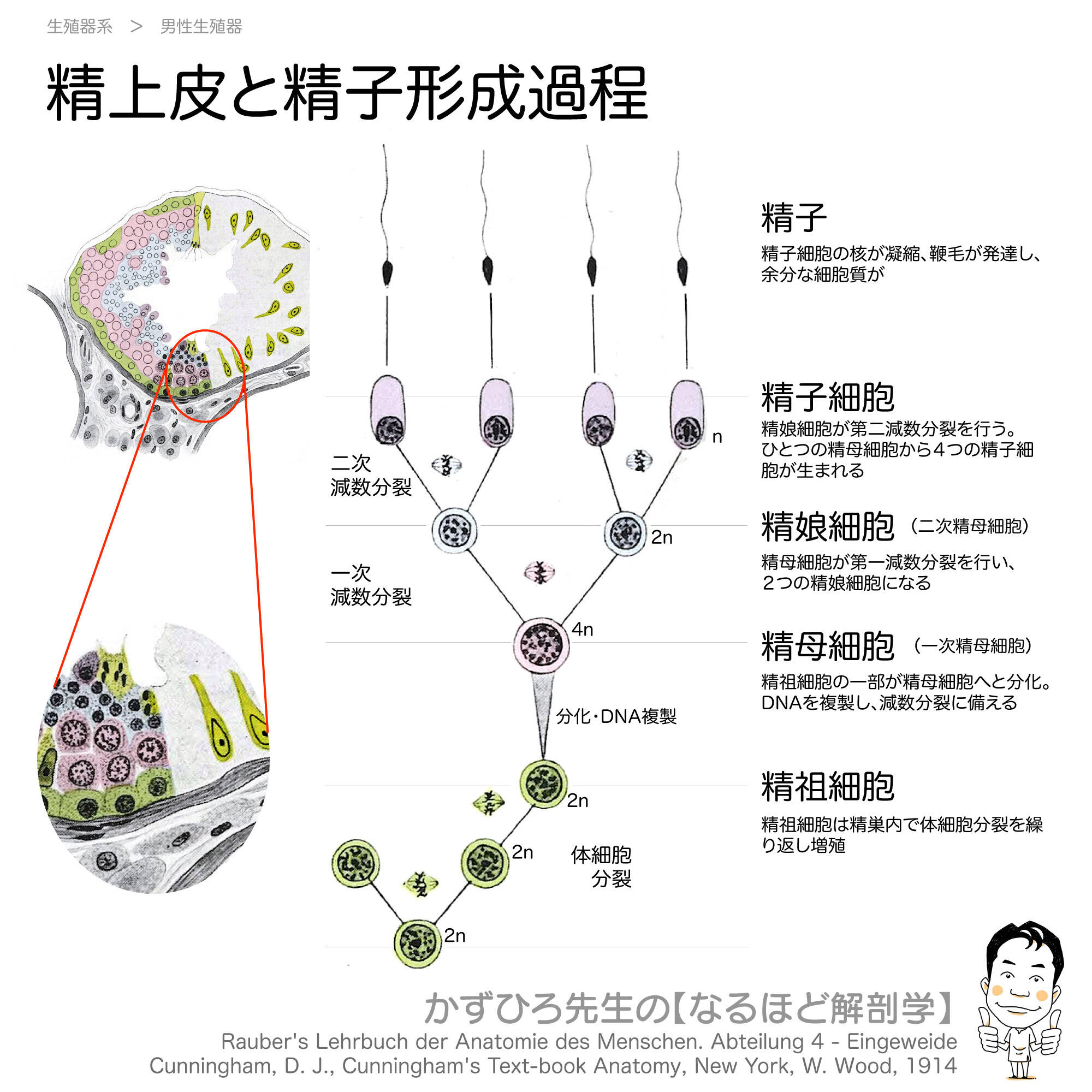 精子細胞は変態(核の凝縮、鞭毛の発達、細胞質の排除)を経て精子となります。精祖細胞は体細胞分裂で増殖し、1つの精母細胞から4つの精子が形成され、精娘細胞の染色体数はnです。