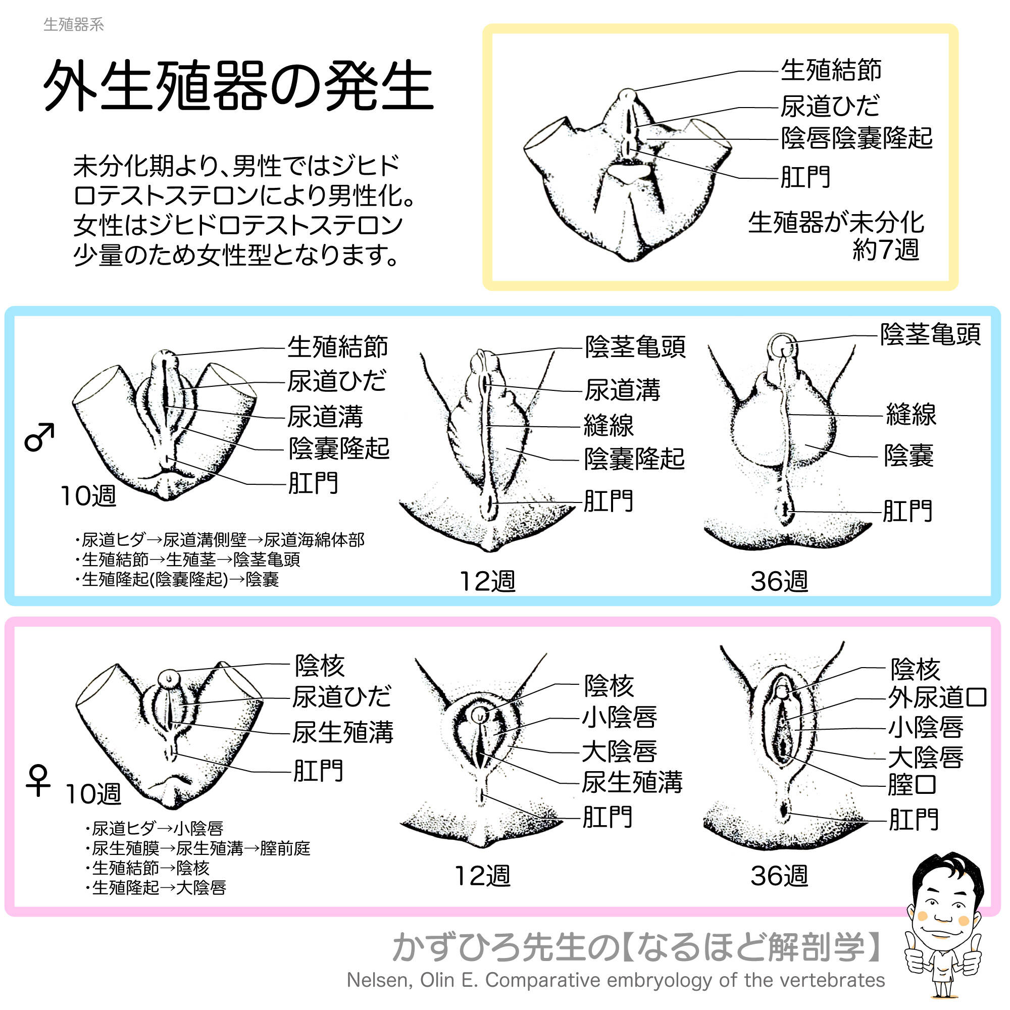 生殖結節は男性では陰茎亀頭、女性では陰核に分化します。陰嚢は陰唇陰嚢隆起から、小陰唇は尿道ひだから分化します。