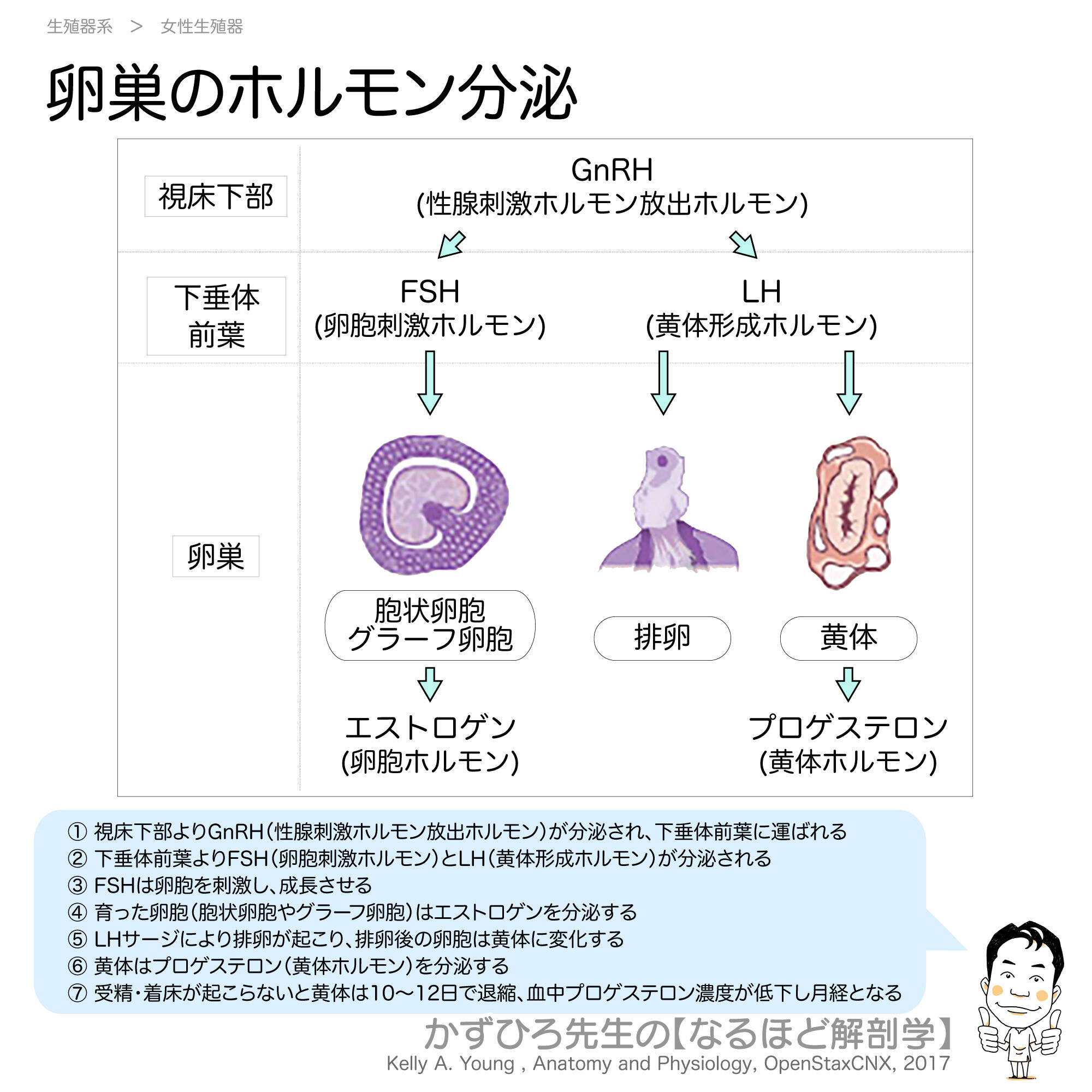 GnRHは視床下部から、FSHは下垂体前葉から分泌されます。エストロゲンは卵胞から、プロゲステロンは黄体から分泌されます。