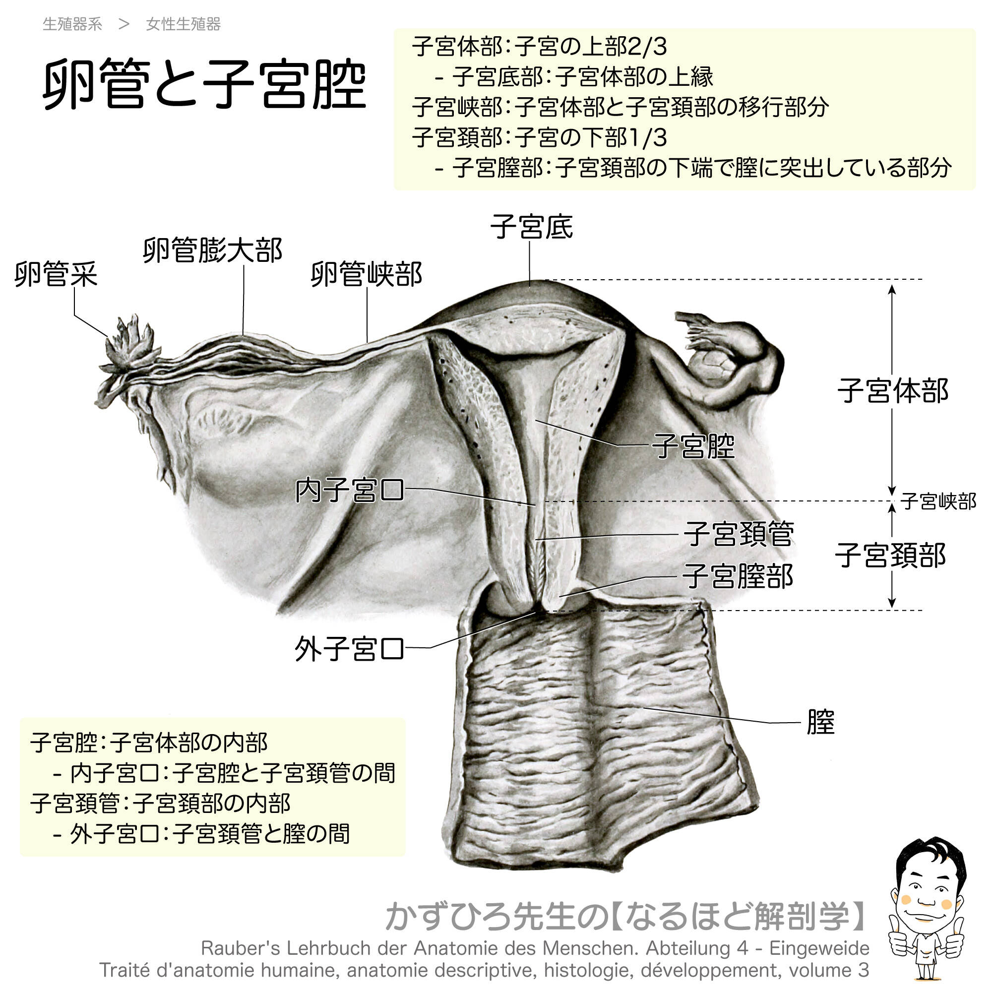 子宮体部は子宮の上部2/3を占め、子宮頸部は下部1/3を占めます。