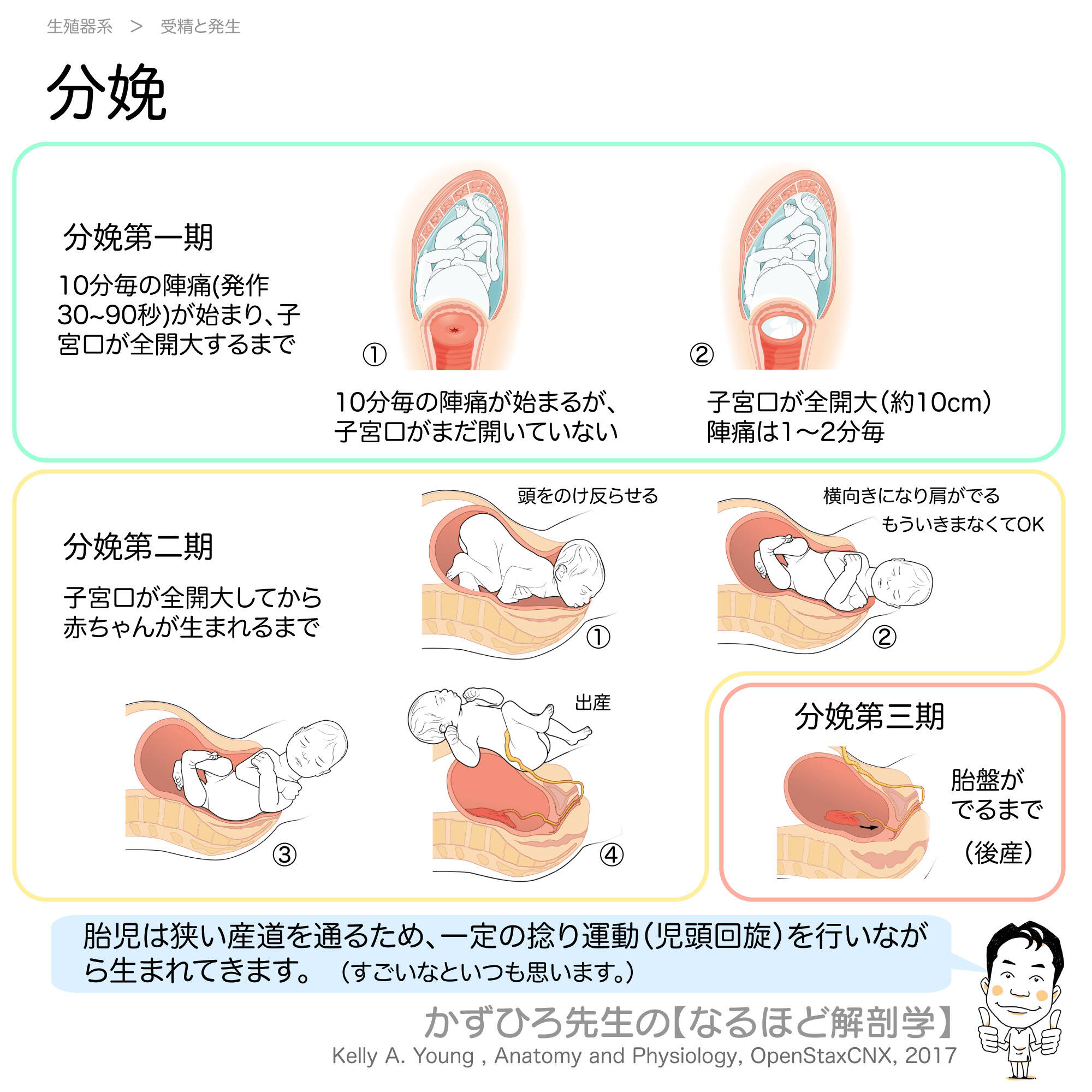 分娩は、胎児が母体から出てくる過程で、分娩第一期、分娩第二期、分娩第三期の3つの段階に分けられます。胎児は狭い産道を通るため、一定の捻り運動(児頭回旋)を行いながら生まれてきます。この記事では、分娩の各段階と児頭回旋について詳しく解説します。