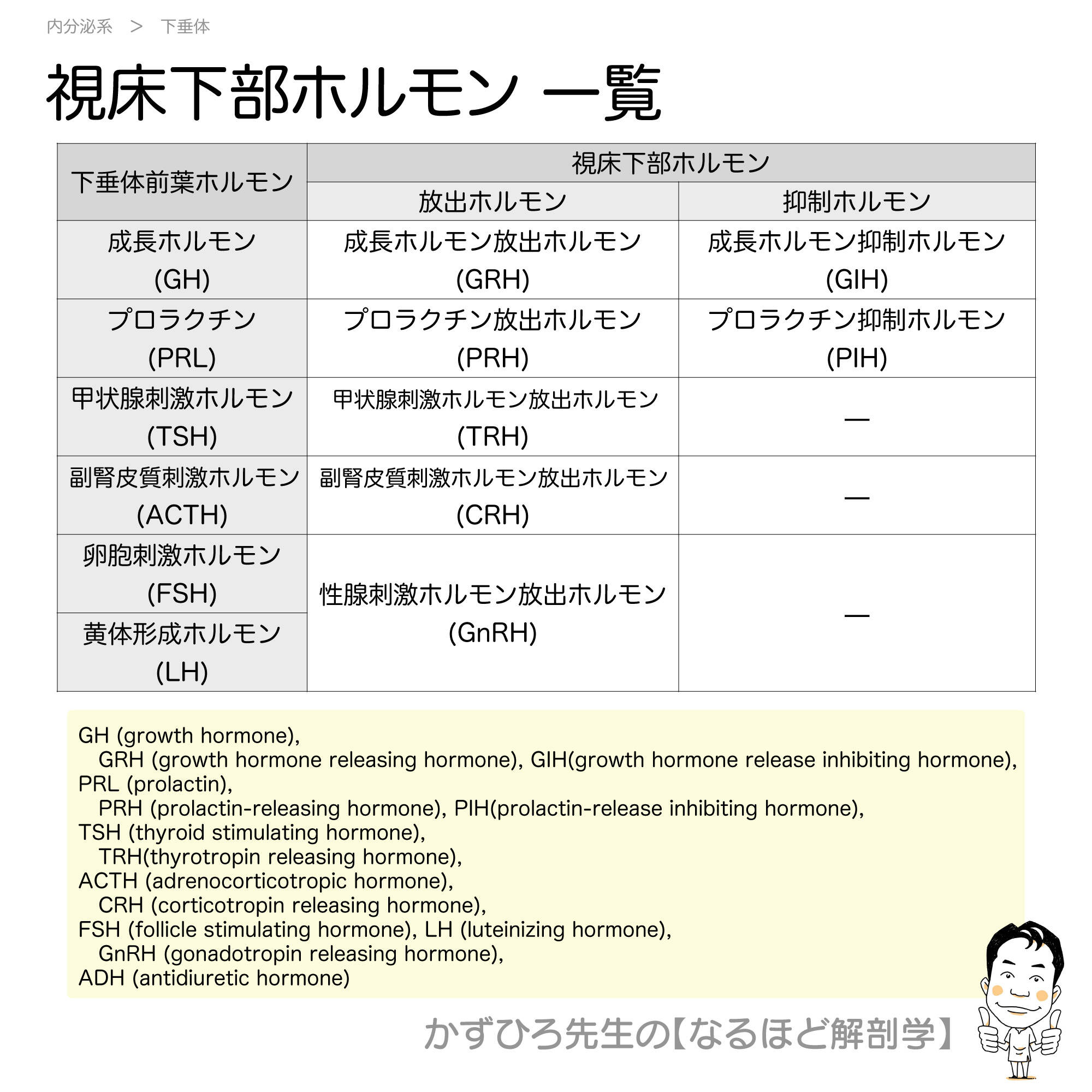 | 成長ホルモン(GH) | GRH(成長ホルモン放出ホルモン) | GIH(成長ホルモン抑制ホルモン)=ソマトスタチン |