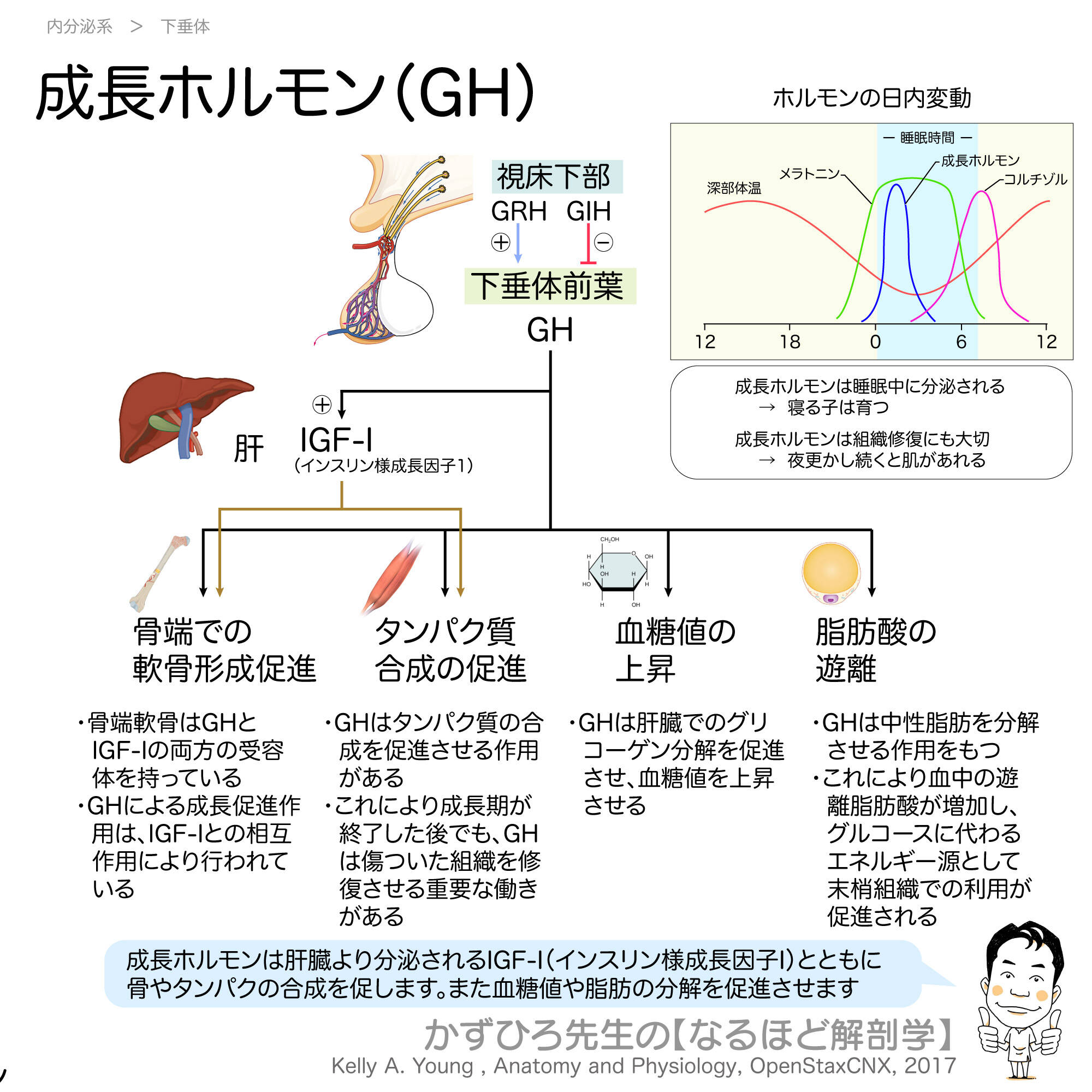 GHはタンパク質合成と骨端軟骨形成を促進します。血糖値は上昇させ、脂肪は分解します。