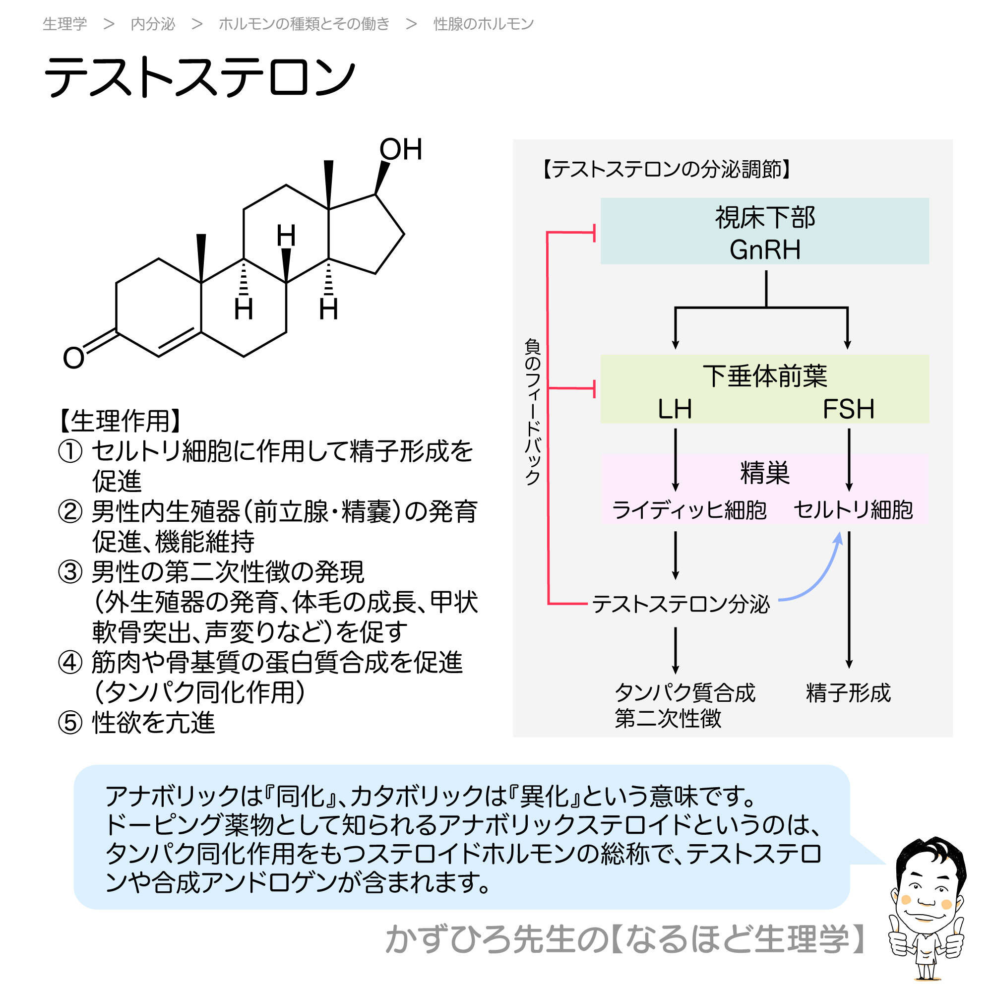 - 5つの作用:精子形成、内生殖器発育、二次性徴、タンパク同化、性欲亢進