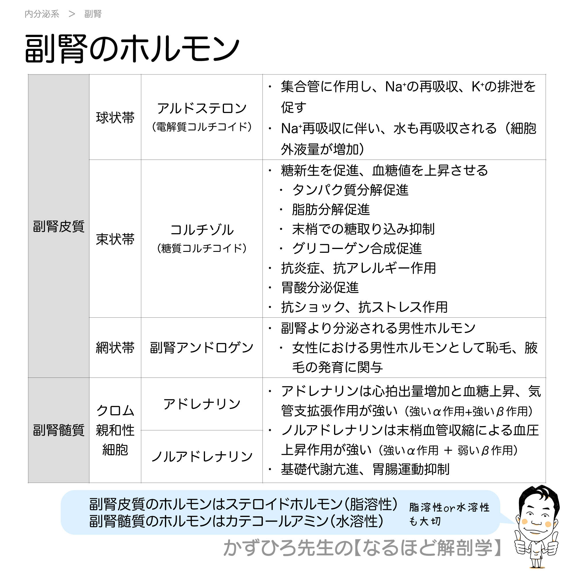 副腎髄質ホルモン(アドレナリン、ノルアドレナリン)はカテコールアミンで水溶性です。ステロイドホルモンは副腎皮質から分泌されます。