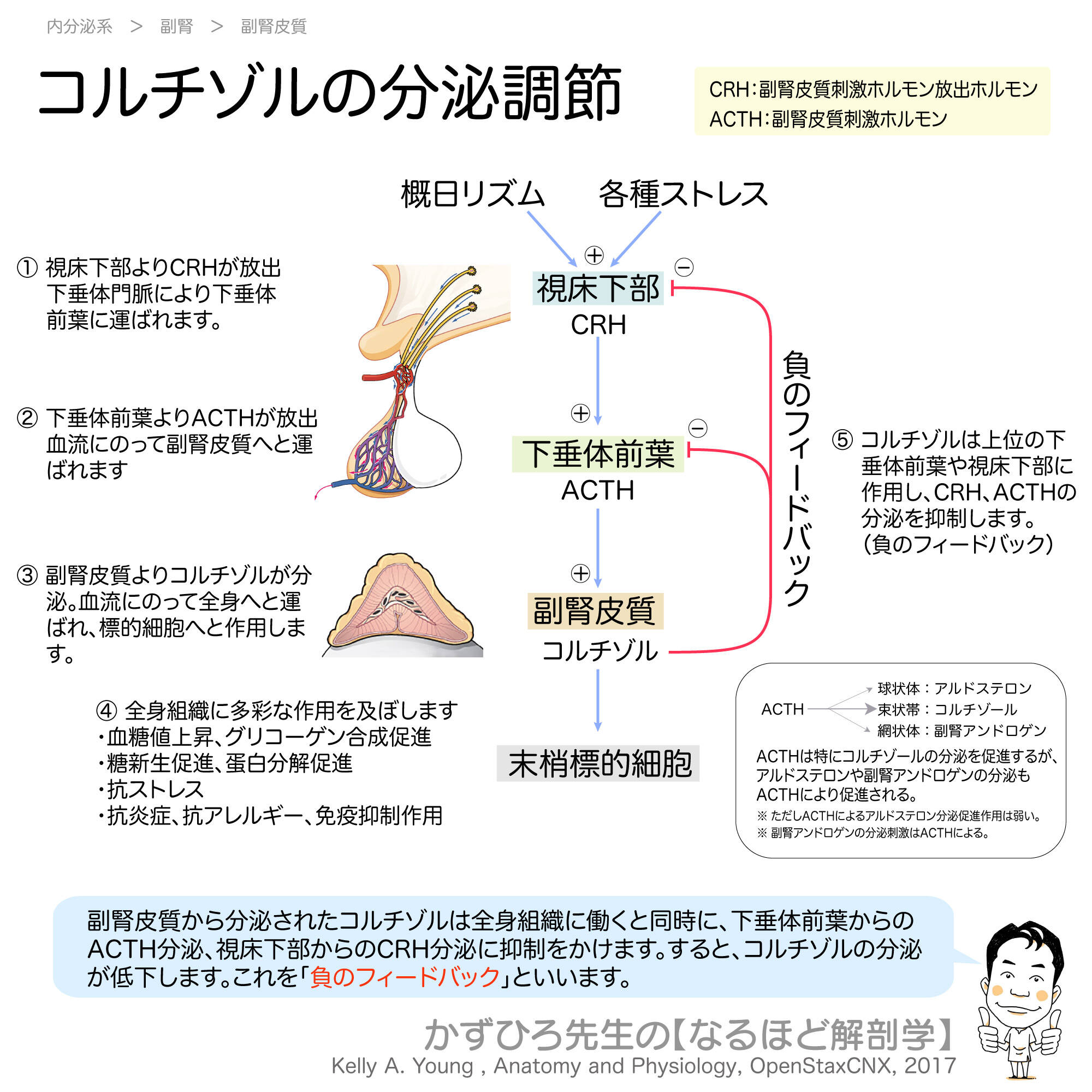 - 負のフィードバック:コルチゾルがCRH、ACTH分泌を抑制