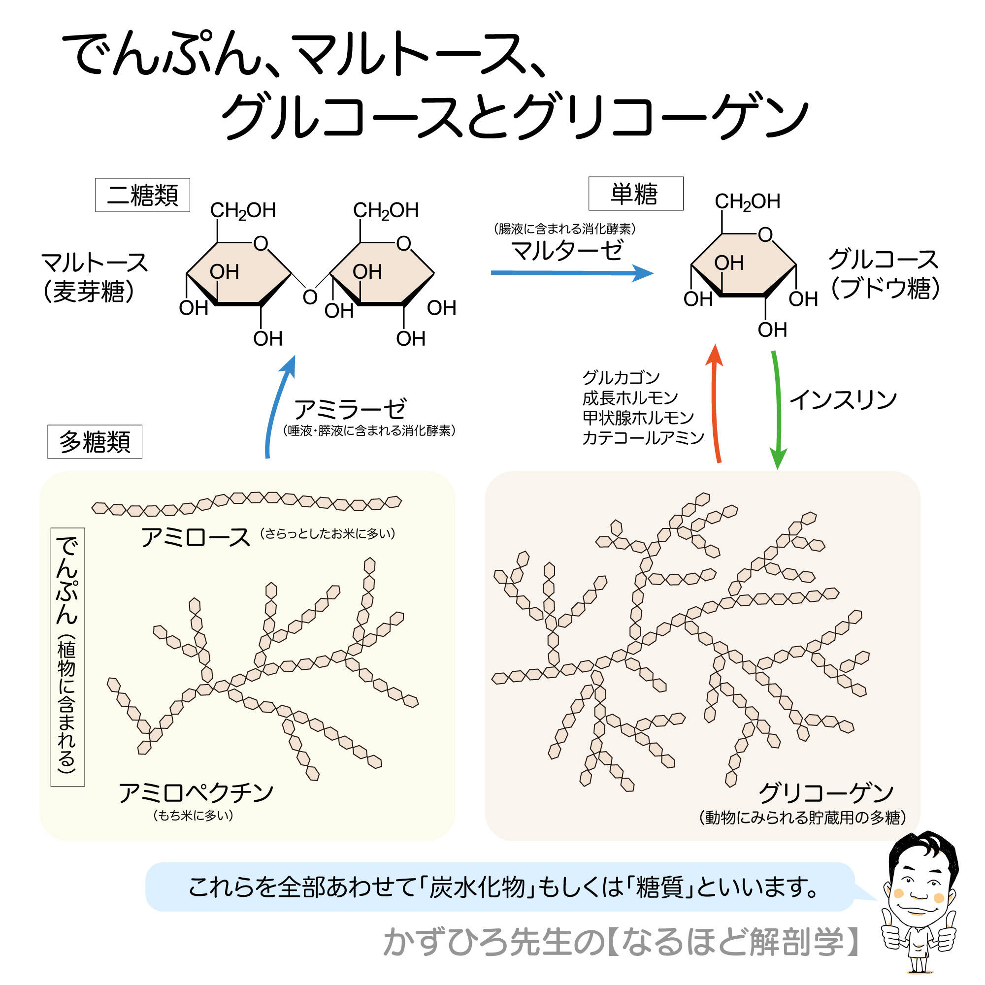 でんぷんはアミラーゼによりマルトースに分解されます。マルトースは二糖類、グルコースは単糖、グリコーゲンは動物に含まれます。