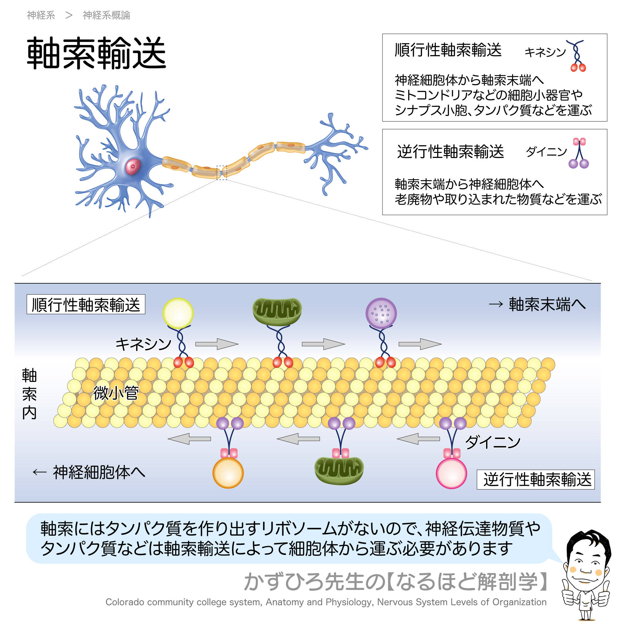 軸索にはリボソームがないため、タンパク質を合成できず、軸索輸送が必要です。