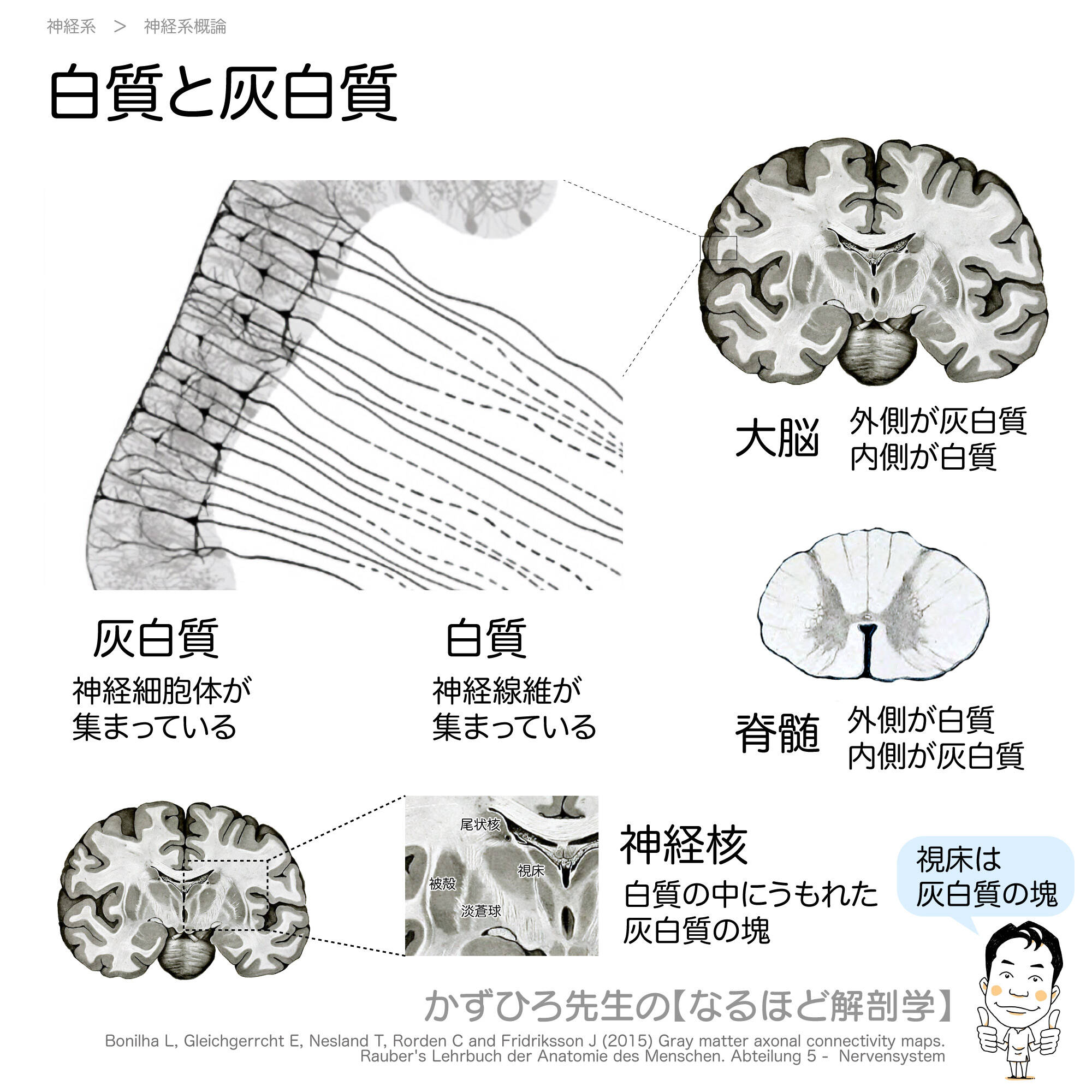 灰白質 = 神経細胞体、白質 = 神経線維(軸索)が基本です。