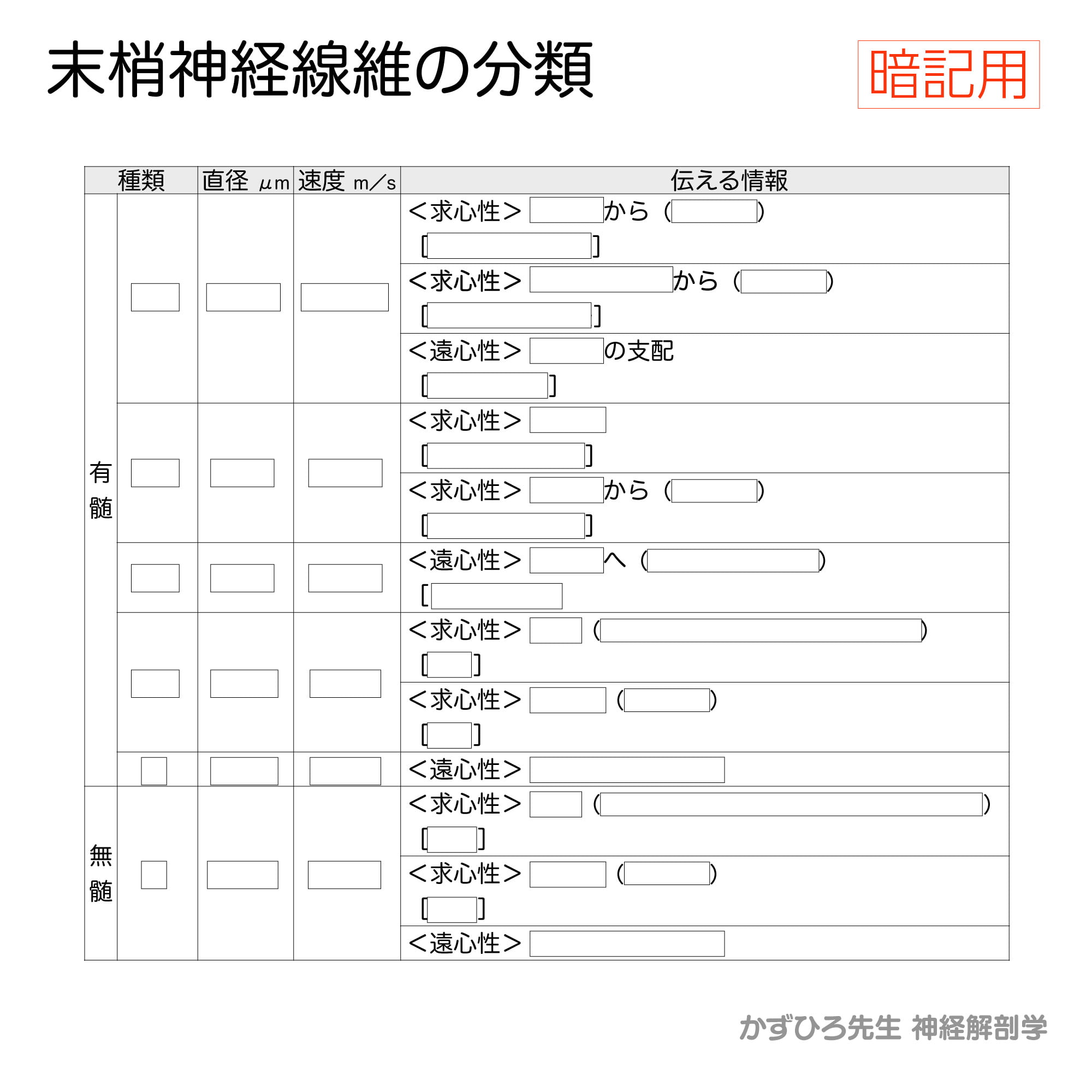本記事は、末梢神経線維の分類を効率的に暗記するための最終確認用シートです。国家試験では神経線維の種類・直径・伝導速度・機能の組み合わせが繰り返し問われます。空欄を自分で埋めながら学習することで、確実な知識の定着を図りましょう。試験直前の総復習にも活用できる内容となっています。