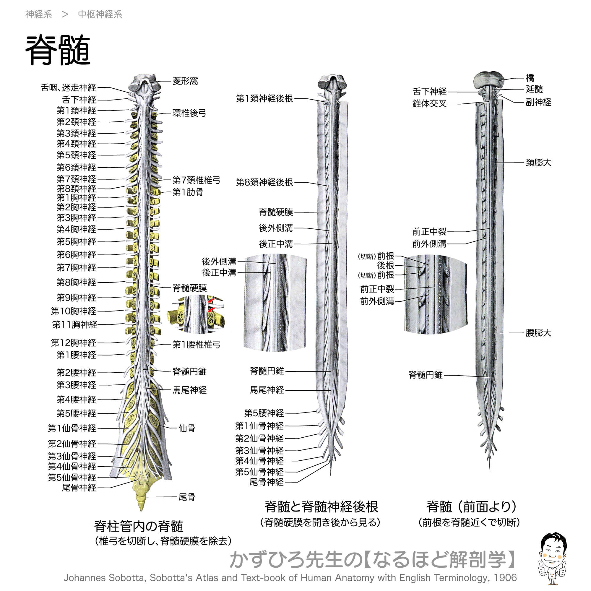 脊髄は脊柱管内を走行する中枢神経であり、31対の脊髄神経を出します。特に「頚神経は8対」という点は頻出です。この記事では、脊髄の区分、構造、被膜について詳しく解説します。