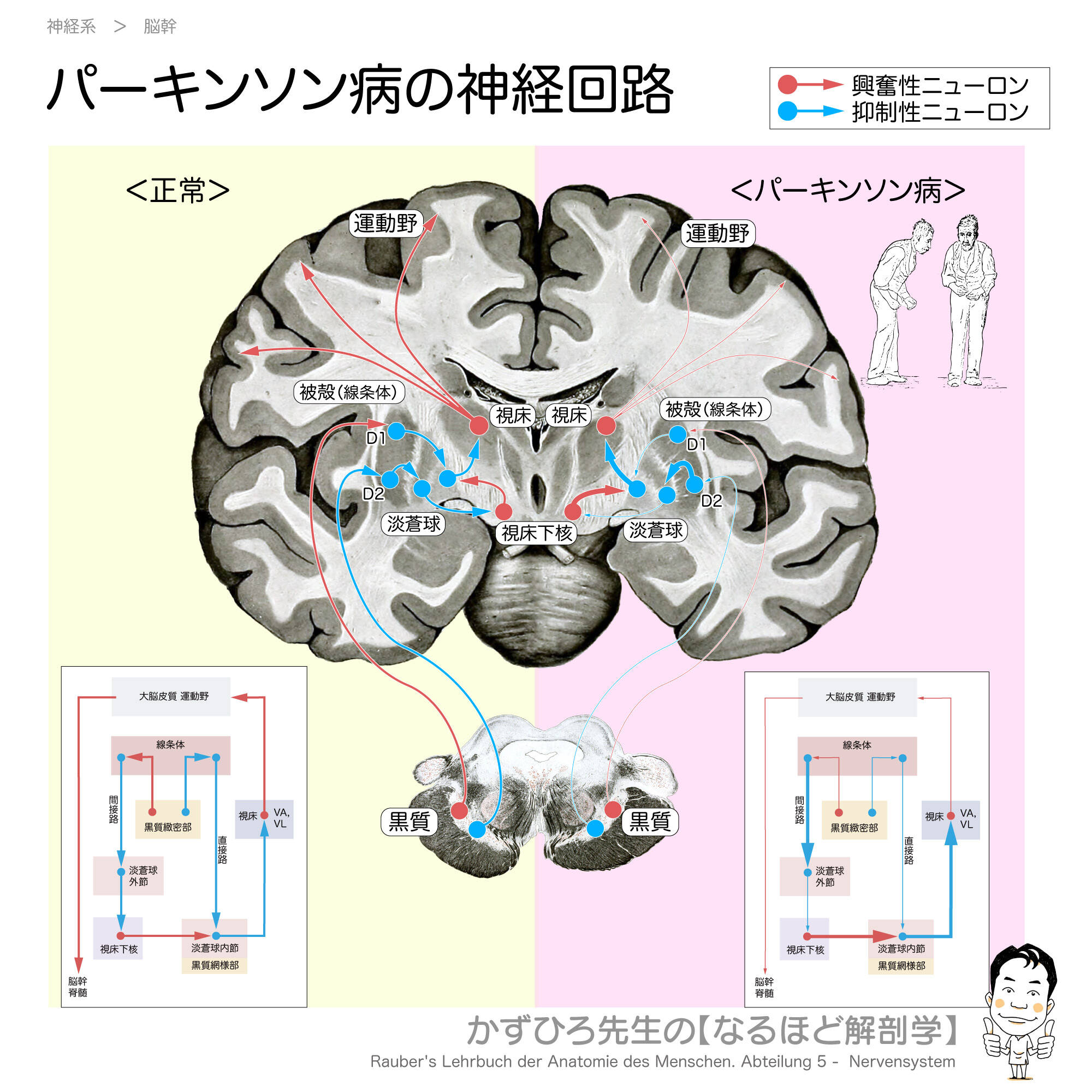 パーキンソン病は黒質からのドパミン神経が変性する疾患です。大脳基底核の神経回路を理解することで、パーキンソン病の症状がなぜ起こるのかを理解できます。この記事では、正常な神経回路とパーキンソン病での変化について解説します。