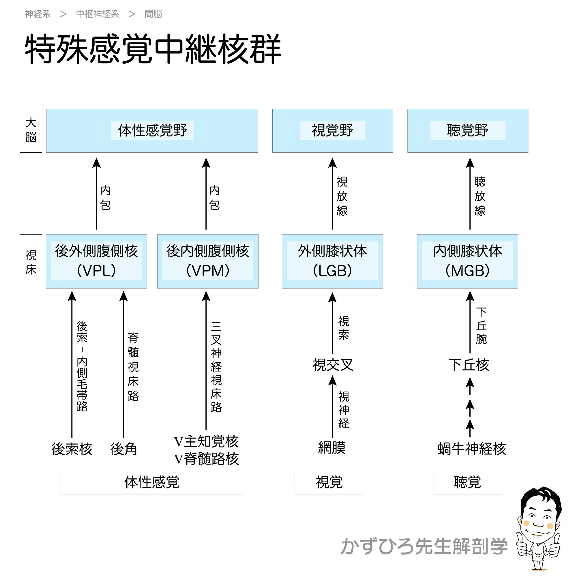 | 後外側腹側核(VPL) | 後索-内側毛帯路 | 後索核(薄束核・楔状束核) | 体性感覚野(内包経由) |