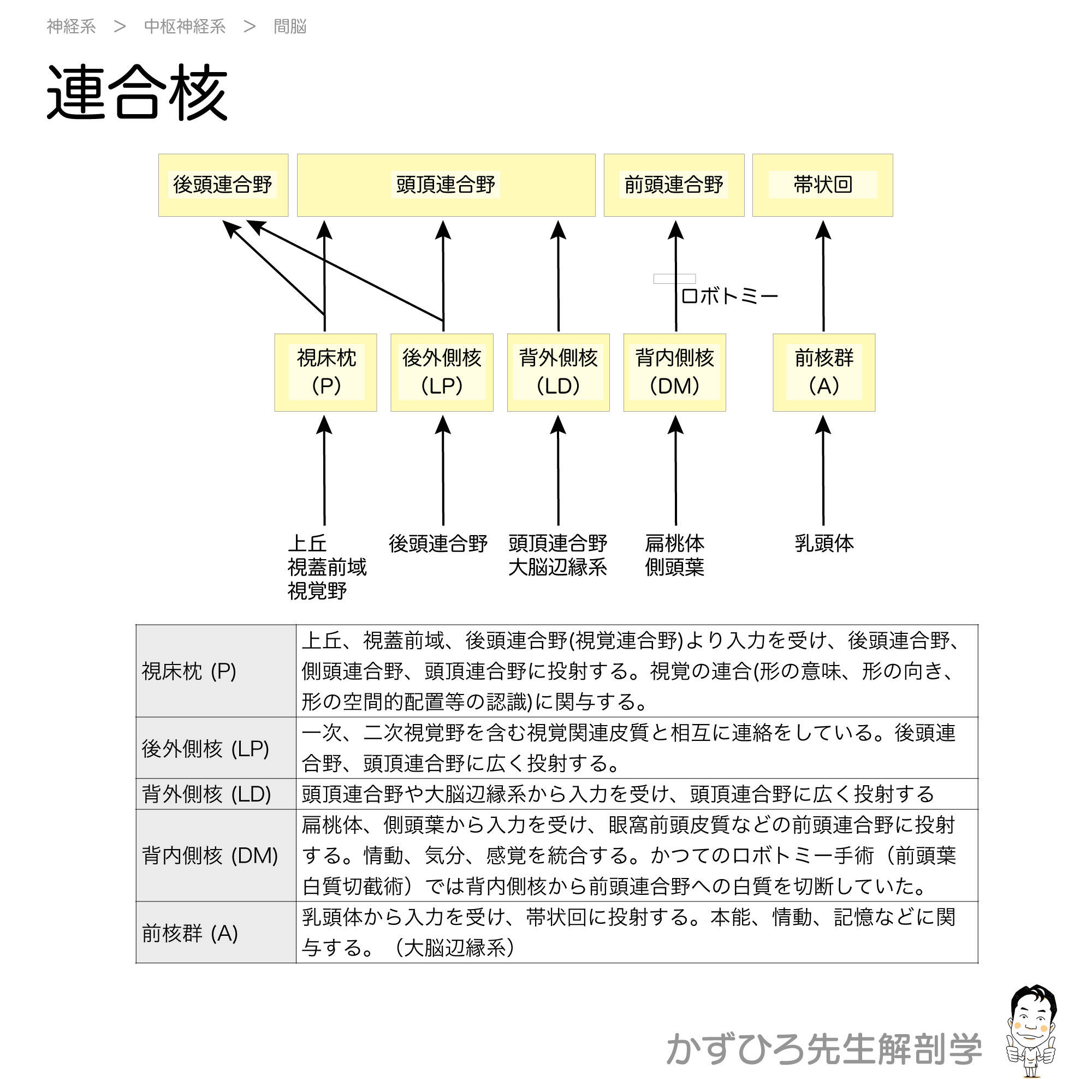 前核群は乳頭体から入力を受け、帯状回に投射します。視床枕は後頭・側頭・頭頂連合野、背内側核は前頭連合野、外側後核は頭頂連合野、背外側核も頭頂連合野に投射します。