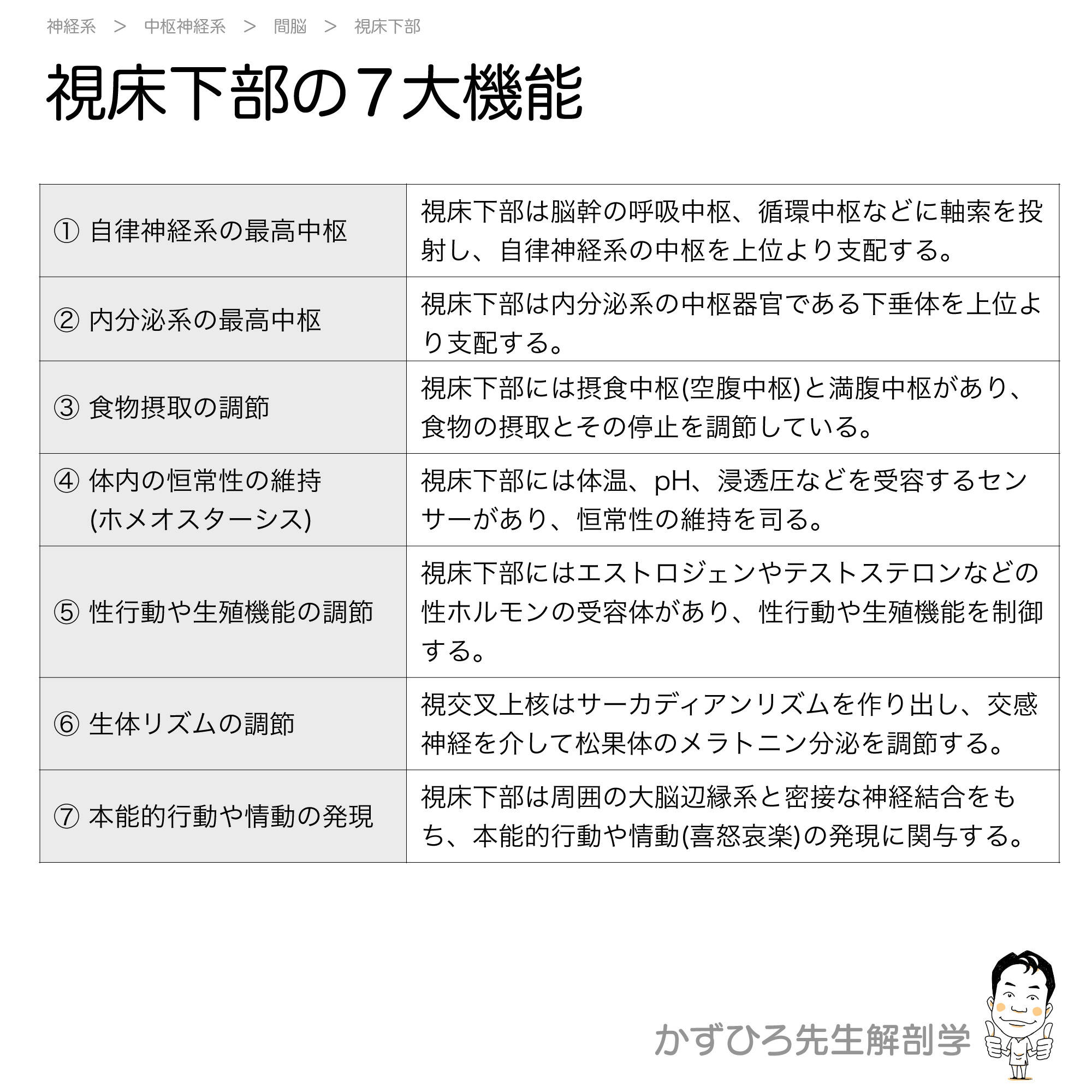 視床下部の7大機能は、(1)自律神経系の最高中枢、(2)内分泌系の最高中枢、(3)食物摂取の調節、(4)ホメオスタシスの維持、(5)性行動・生殖機能の調節、(6)生体リズムの調節、(7)本能的行動・情動の発現です。これらの機能と関連する核を対応させて覚えることが、国家試験対策の基本となります。