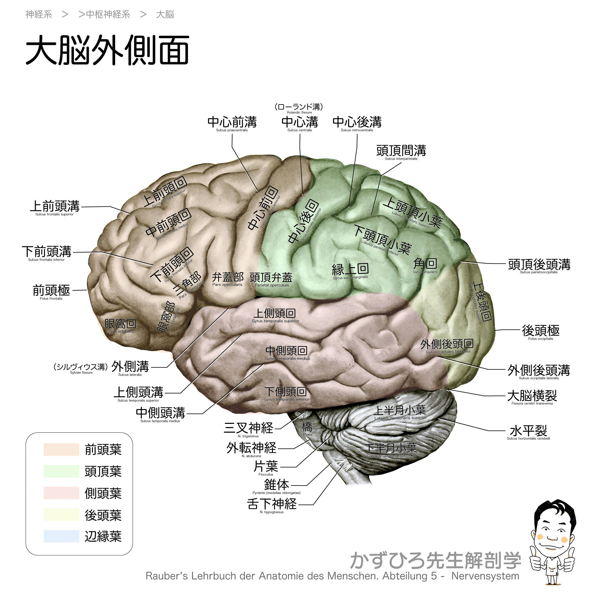外側溝の上方かつ中心溝の前方は前頭葉に属します。中心溝の後方は頭頂葉、外側溝の下方は側頭葉です。