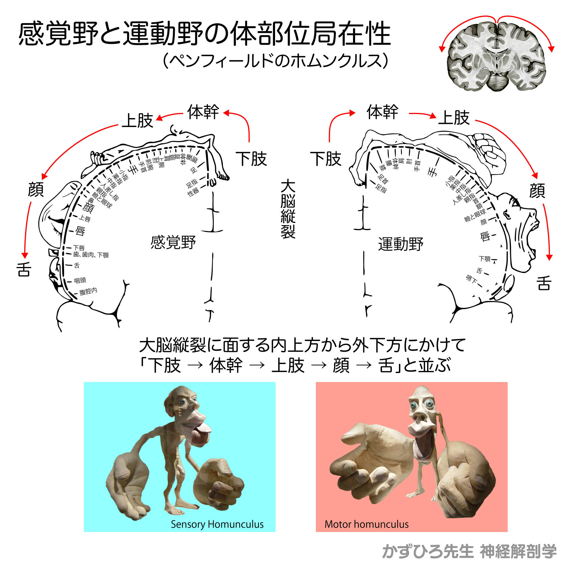 ペンフィールドのホムンクルスは、運動野・感覚野における体部位局在を示します。内上方(大脳縦裂側)から外下方へ「下肢→体幹→上肢→顔→舌」と配列し、細かい制御が必要な手・顔・舌の領域が大きいのが特徴です。中心傍小葉には下肢領域が存在します。