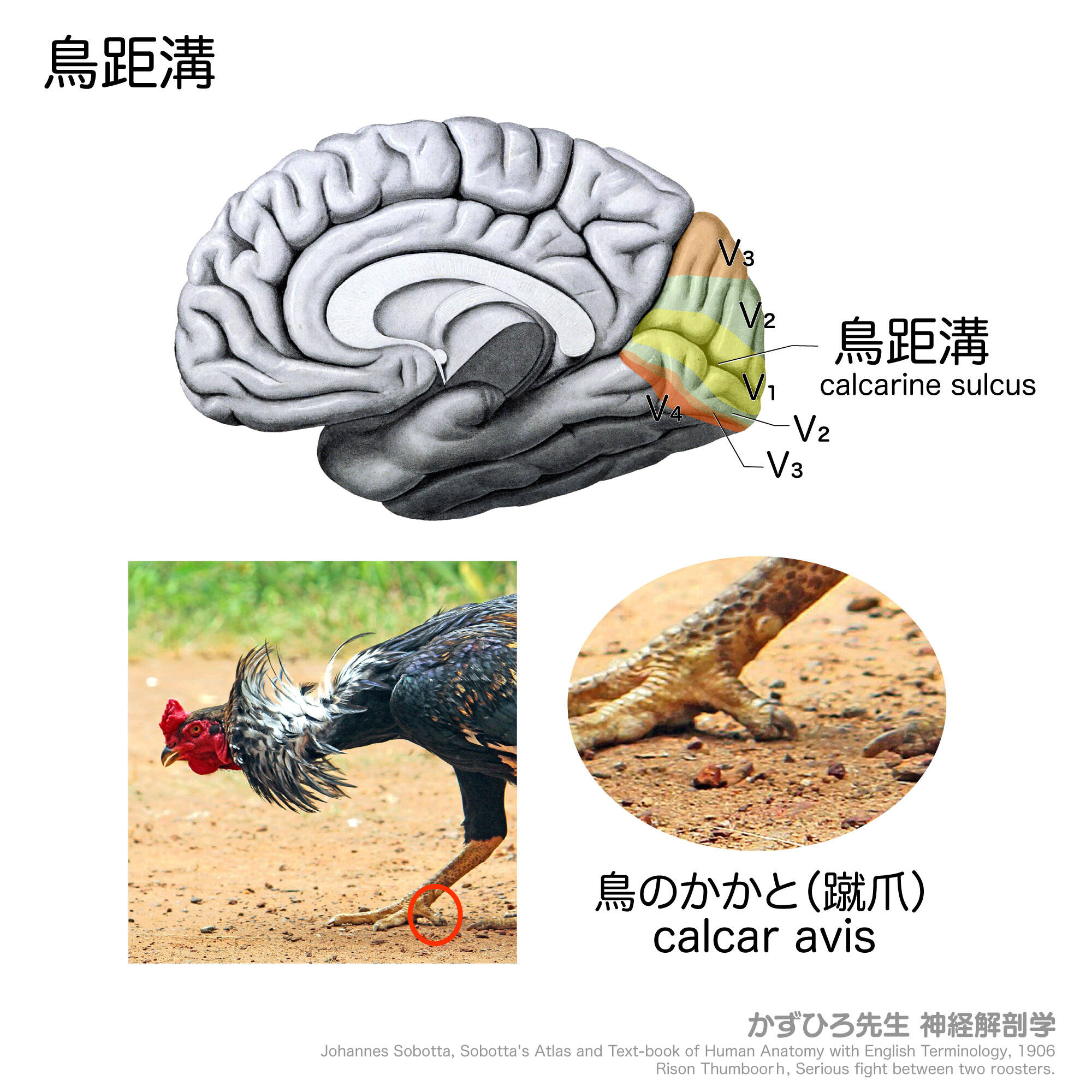 calcarine sulcusのcalcarineは「蹴爪状の」という意味です。