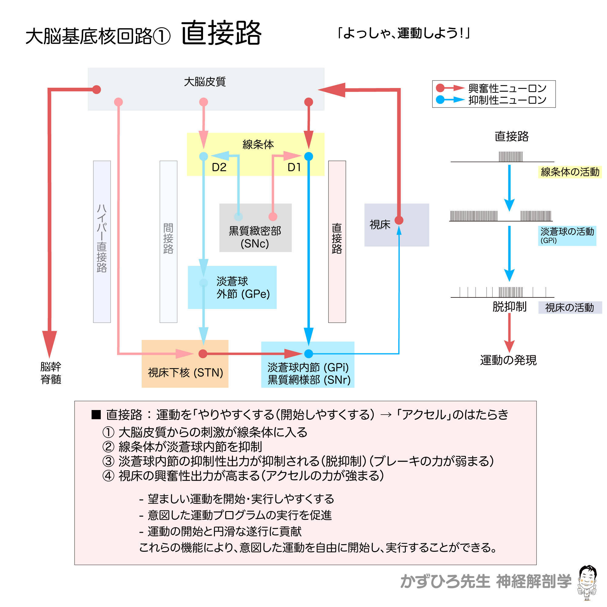 黒質緻密部からのドパミンはD1受容体を介して直接路の線条体ニューロンを興奮させ、運動を促進します。
