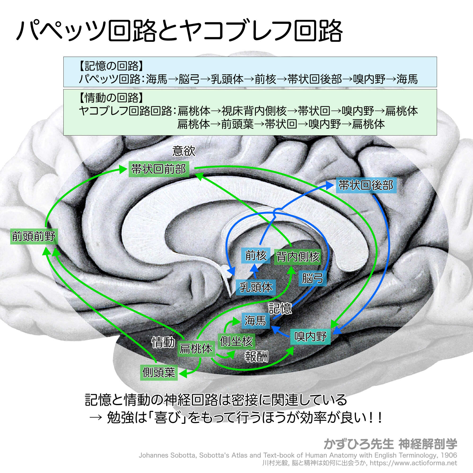 パペッツ回路(記憶)とヤコブレフ回路(情動)は帯状回・嗅内野を共有し密接に関連します。情動を伴う記憶は強化されます。