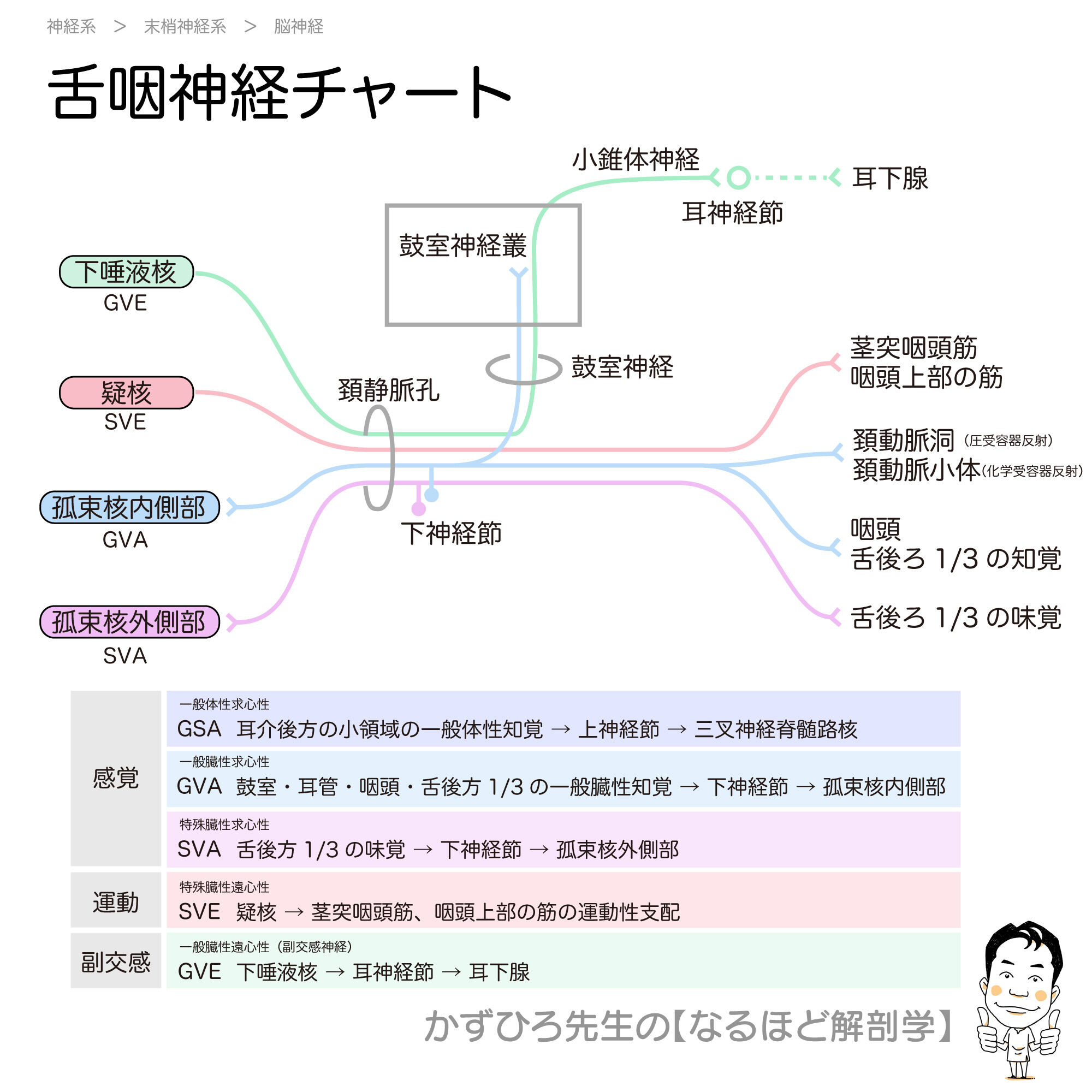 | 感覚(臓性) | GVA | 咽頭・舌後1/3→下神経節→孤束核内側部 |