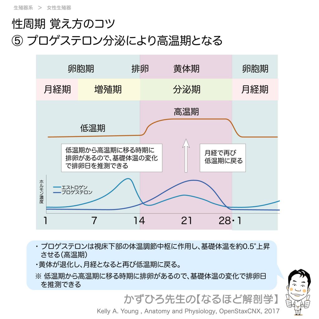 性周期覚え方のコツ(5) プロゲステロン分泌により高温期となる - 完全攻略ガイド はじめに 基礎体温は性周期に伴い低温期と高温期に分かれます。プロゲステロンには体温上昇作用があり、黄体期には基礎体温が約0.5度上昇して高温期となります。低温期から... -