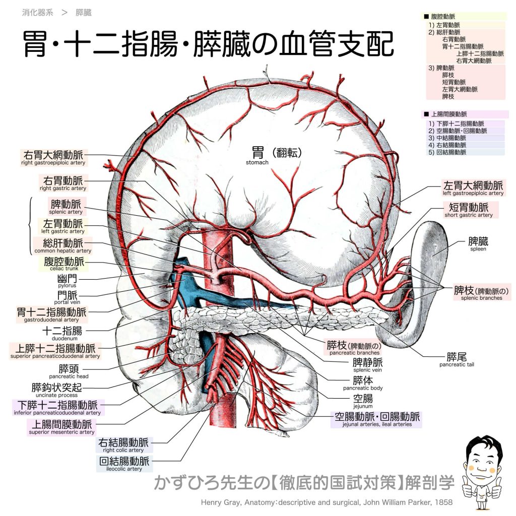 胃・十二指腸・膵臓の血管支配 - 完全攻略ガイド はじめに 腹腔動脈は胃・肝臓・脾臓などの上腹部臓器に血液を供給する重要な動脈です。腹腔動脈の3本の枝とその分布は国家試験で超頻出のテーマです。特に十二指腸と膵頭が腹腔動脈系と上腸間膜動脈系の両... -