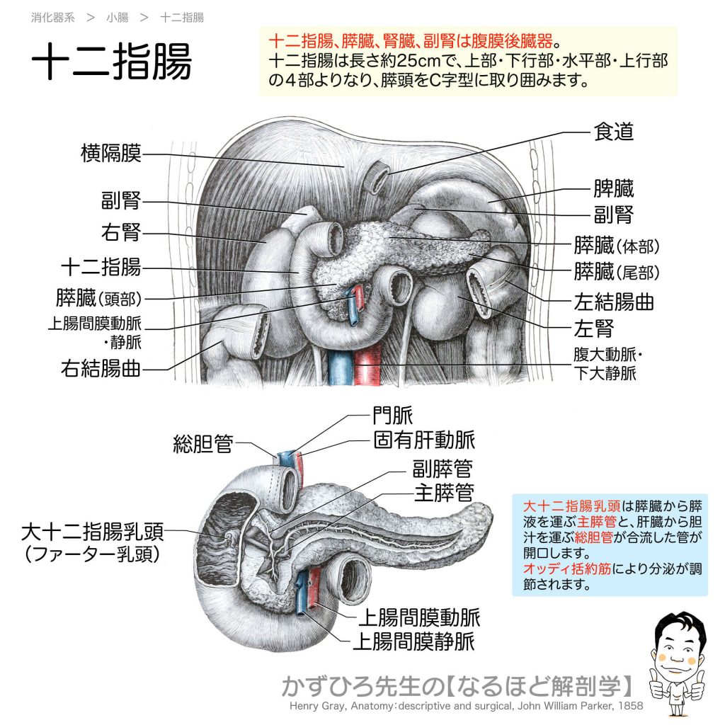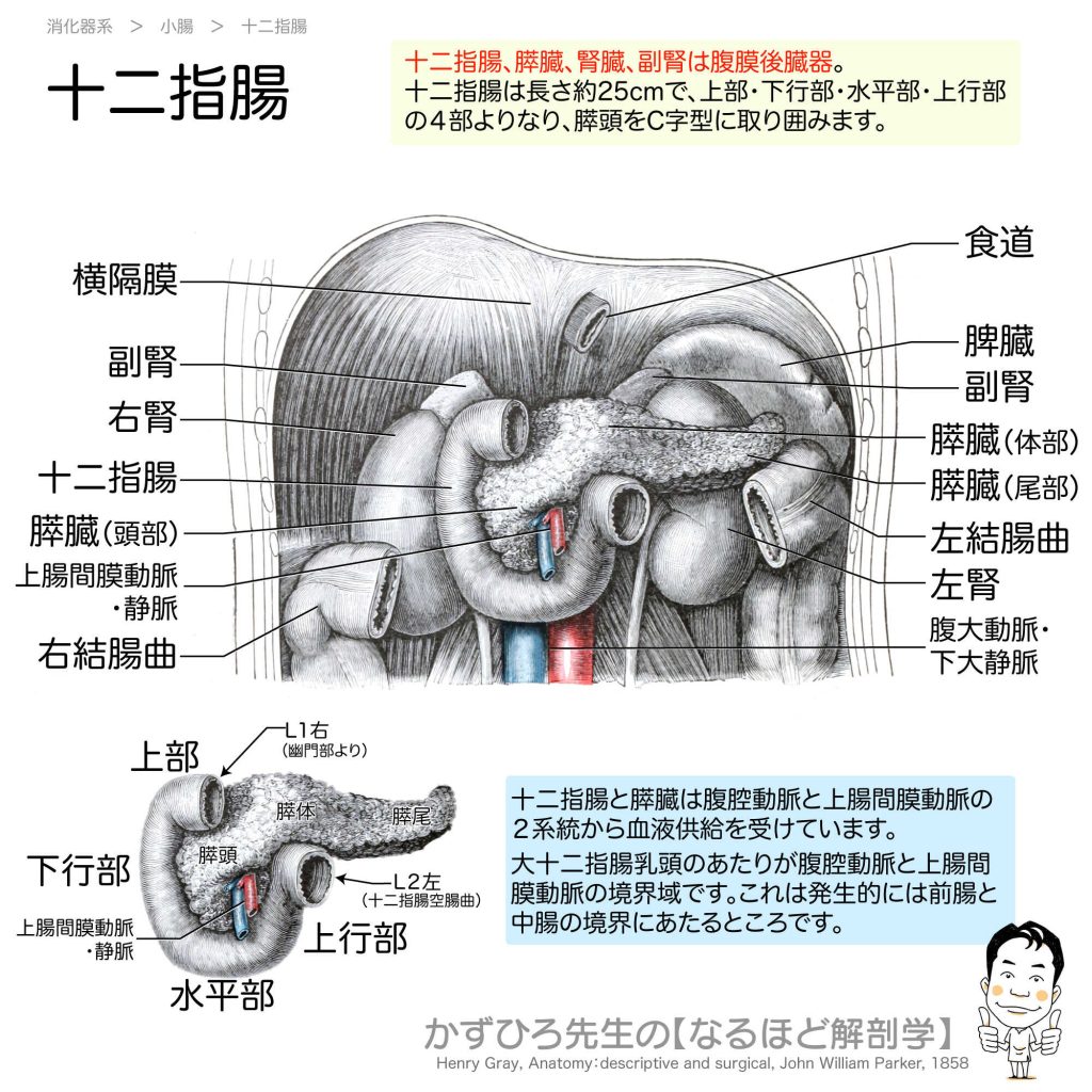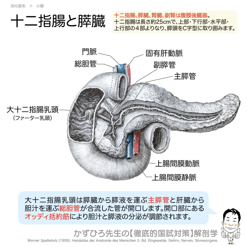 十二指腸 - 完全攻略ガイド はじめに 十二指腸は小腸の最初の部分で、約25cm(指12本分の幅)の長さがあります。膵頭をC字型に取り囲み、腹膜後器官として後腹壁に固定されています。4つの部分と大十二指腸乳頭の位置は国家試験で頻出です。 詳しい解説 基... -