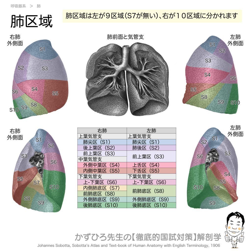 肺区域 - 完全攻略ガイド はじめに 肺区域は区域気管支が支配する肺の領域で、右肺は10区域、左肺は9区域に分かれます。特に左肺にS7がないことは国試頻出です。この記事では、肺区域の構成と各区域の名称を詳しく解説します。 詳しい解説 肺区域の数 肺 ... -