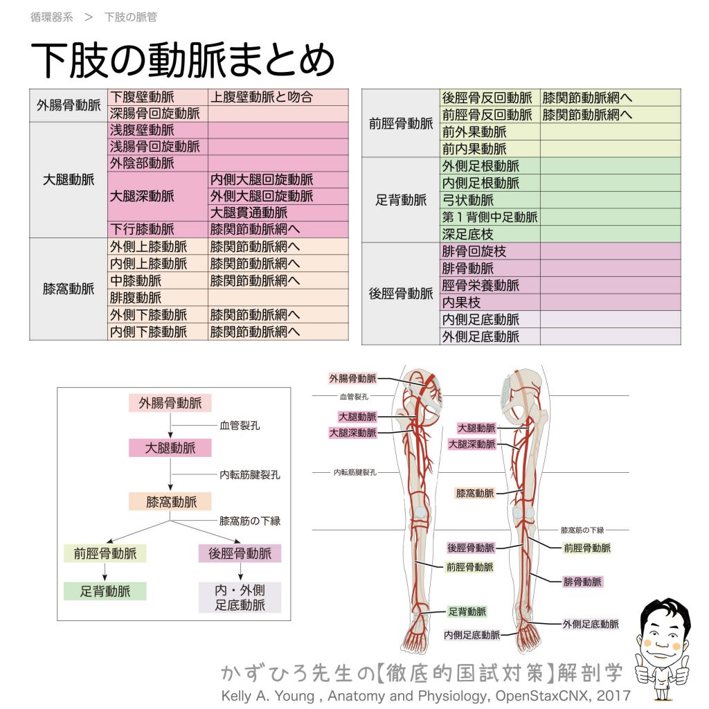 下肢の動脈まとめ - 完全攻略ガイド はじめに 下肢の動脈の全体像を把握することは、循環器系の学習において非常に重要です。外腸骨動脈から足底動脈までの全ての枝を系統的に整理し、各動脈の分枝と分布を理解しましょう。特に膝関節動脈網と足底動脈弓は... -