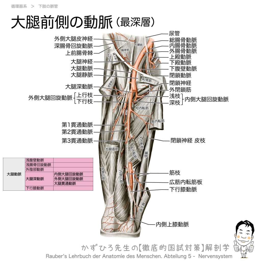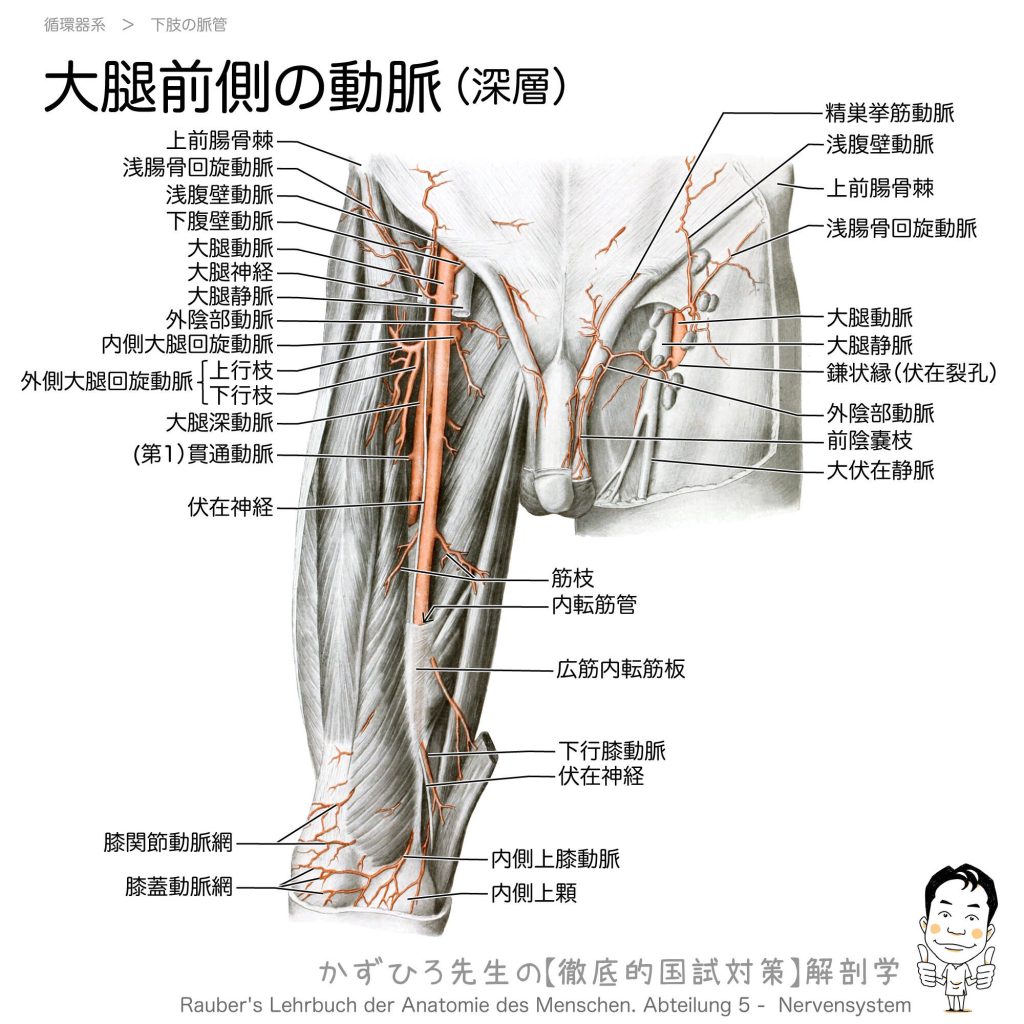 大腿前側の動脈(深層) - 完全攻略ガイド はじめに 大腿前側深層では、内転筋管(ハンター管)と伏在神経の関係が重要です。大腿動脈は内転筋管を通過して膝窩動脈に移行します。内転筋管を通過する構造物と、伏在裂孔を通過する大伏在静脈の知識は国家試... -