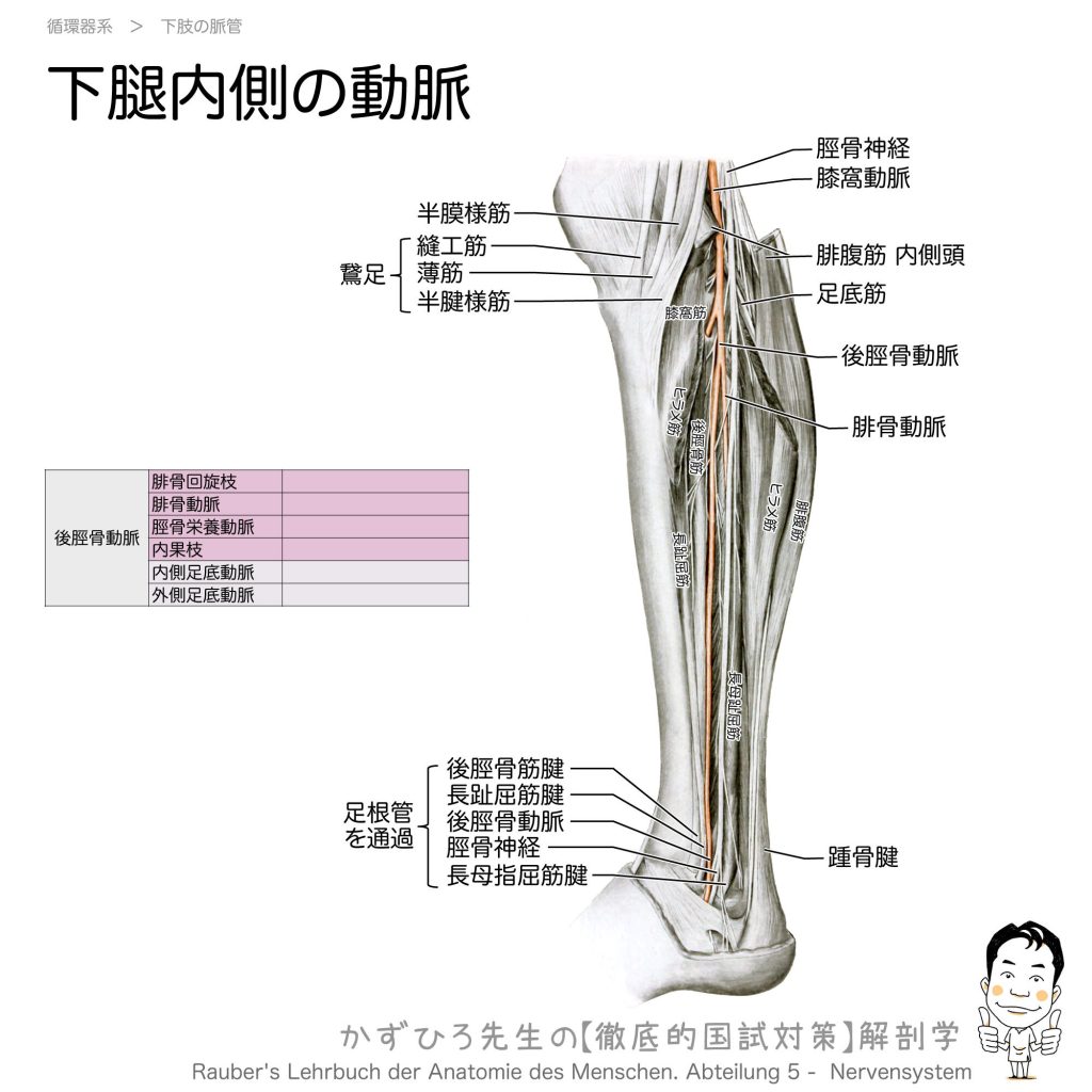 下腿内側の動脈 - 完全攻略ガイド はじめに 下腿内側では、後脛骨動脈が足根管を通過して足底に達する経路が重要です。足根管を通過する構造物の順序は国家試験で頻出のテーマです。また、鵞足を構成する3つの筋も解剖学の基本として押さえておきましょう... -