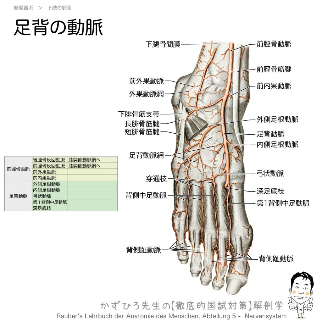 下腿前側の動脈 - 完全攻略ガイド はじめに 前脛骨動脈は膝窩動脈から分岐し、骨間膜を貫いて下腿前側を走行します。足関節の前方で足背動脈に移行し、足背の血液供給を担います。前脛骨動脈と深腓骨神経が併行することは国家試験で頻出のポイントです。 ... -