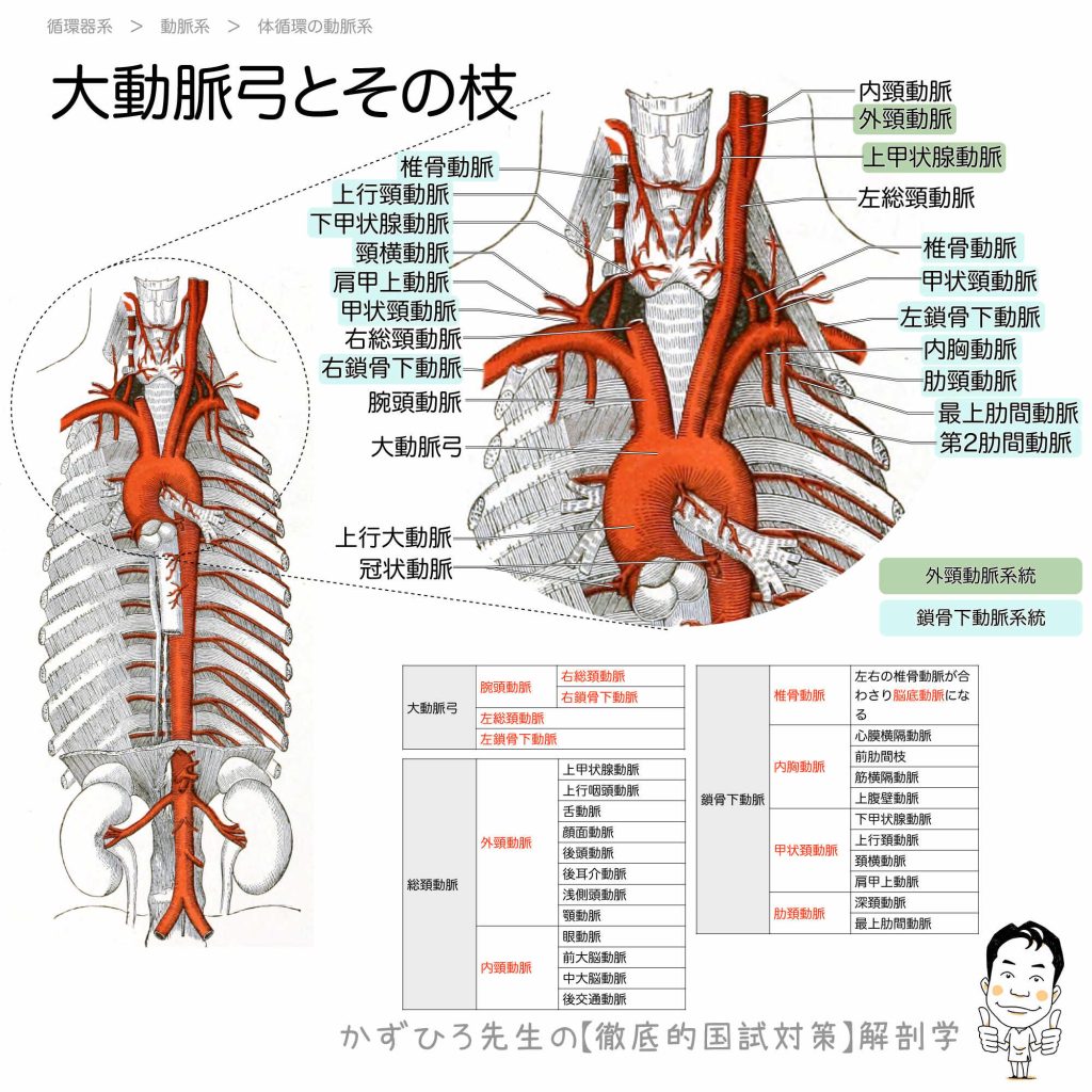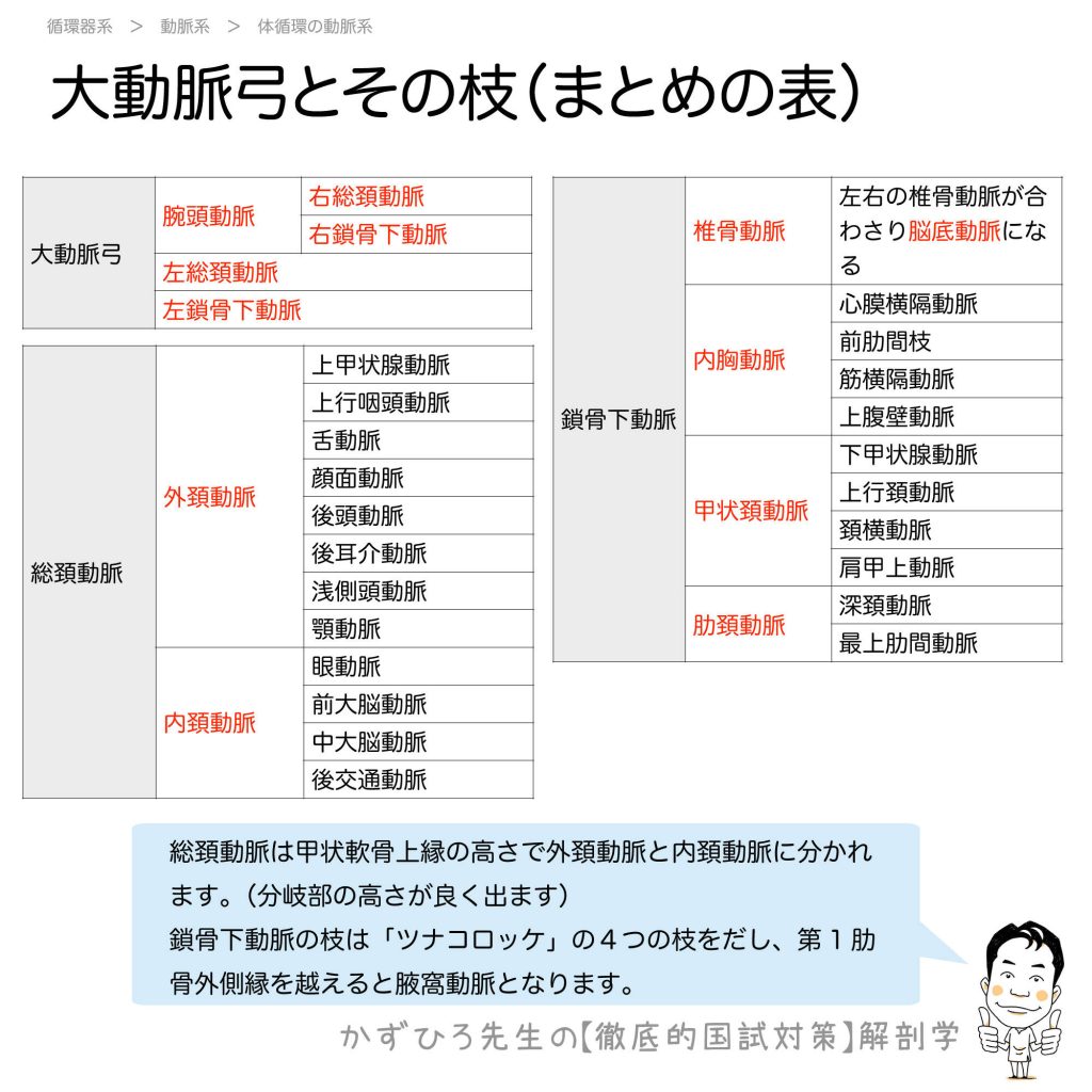 大動脈弓とその枝(まとめの表) - 完全攻略ガイド はじめに 大動脈弓からは腕頭動脈、左総頚動脈、左鎖骨下動脈の3本が分岐します。総頚動脈は甲状軟骨上縁の高さで外頚動脈と内頚動脈に分かれ、鎖骨下動脈は「ツナコロッケ」で覚える4つの枝を出します。... -