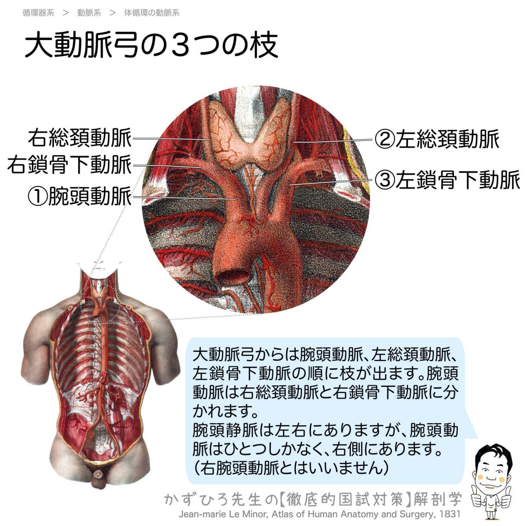 大動脈弓の3つの枝 - 完全攻略ガイド はじめに 大動脈弓からは腕頭動脈、左総頚動脈、左鎖骨下動脈の順に3本の枝が出ます。重要なのは、腕頭動脈は1本のみで右側にあり、「右腕頭動脈」とは呼ばないという点です。一方、腕頭静脈は左右両側に存在します。 ... -