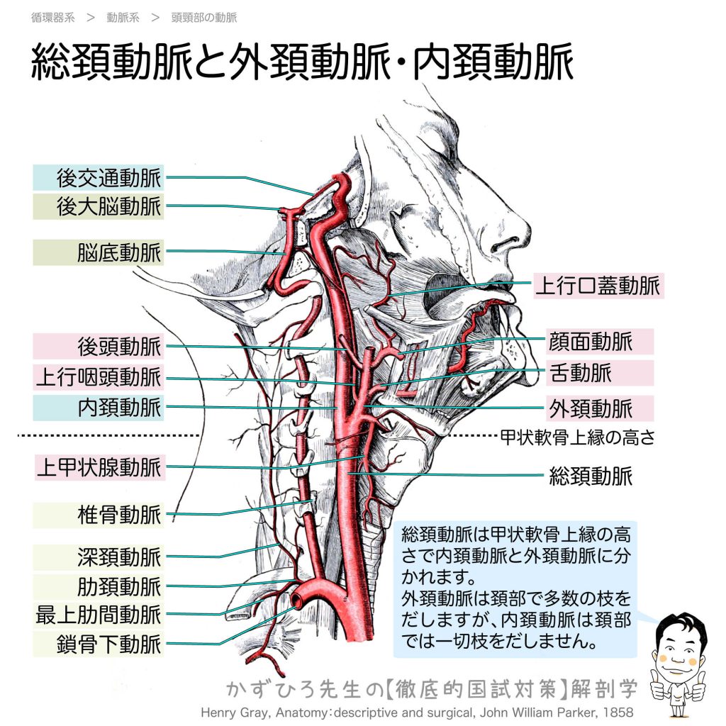 総頚動脈と外頚動脈・内頚動脈 - 完全攻略ガイド はじめに 頭部への血液供給を担う総頚動脈は、内頚動脈と外頚動脈に分岐します。この2つの動脈は、頸部での枝の出し方や栄養領域が全く異なります。国家試験でも超頻出のテーマですので、その違いをしっか... -