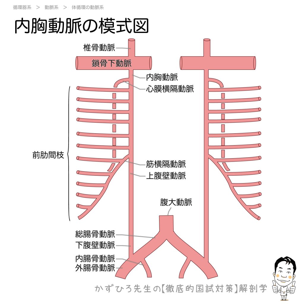 内胸動脈の模式図 - 完全攻略ガイド はじめに 内胸動脈は鎖骨下動脈から分枝し、前胸壁を下行して上腹壁動脈に続きます。上腹壁動脈は外腸骨動脈の枝である下腹壁動脈と吻合し、上下の血流を連絡しています。 詳しい解説 内胸動脈の走行 位置 構造 起始 鎖... -