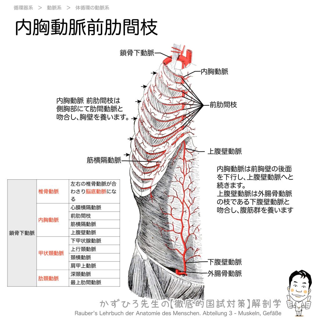 内胸動脈と前肋間枝 - 完全攻略ガイド はじめに 内胸動脈は鎖骨下動脈の枝で、前胸壁の後面を下行します。前肋間枝は側胸部で後肋間動脈と吻合し、胸壁を栄養しています。また、上腹壁動脈は下腹壁動脈と吻合し、腹筋群を栄養します。 詳しい解説 内胸動脈... -