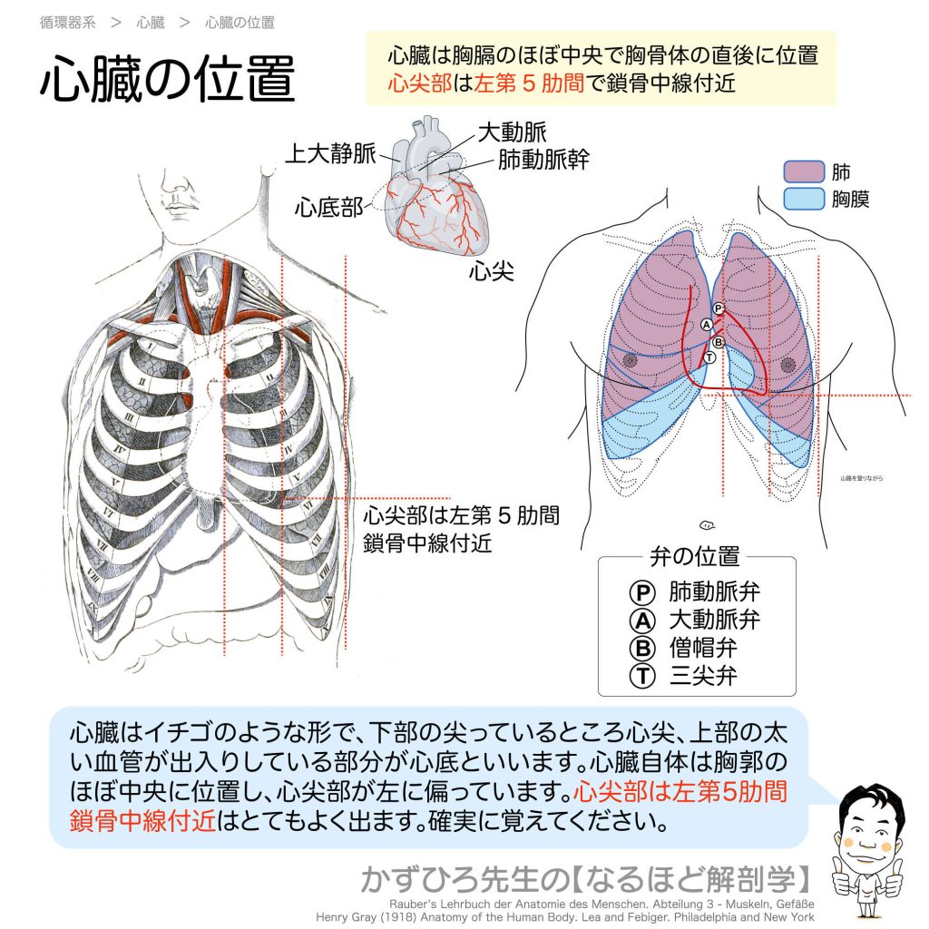 心臓の位置 - 完全攻略ガイド はじめに 心臓の位置は国家試験で頻出のテーマです。特に「心尖部は左第5肋間で鎖骨中線付近」という知識は必ず覚えておく必要があります。また、心臓の弁の聴診部位(PATM)も重要です。この記事では、心臓の位置と周囲の構... -