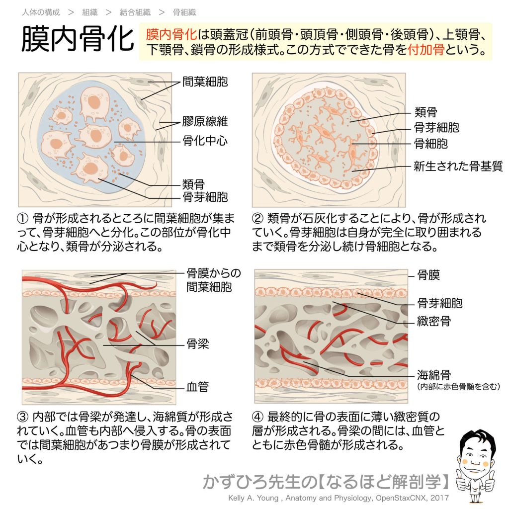 膜内骨化 - 完全攻略ガイド はじめに 膜内骨化は頭蓋冠や鎖骨などの形成様式で、結合組織が直接骨になる過程です。この方式でできた骨を付加骨といいます。今回は膜内骨化について詳しく解説します。 詳しい解説 膜内骨化とは 結合組織が直接骨になる でき... -