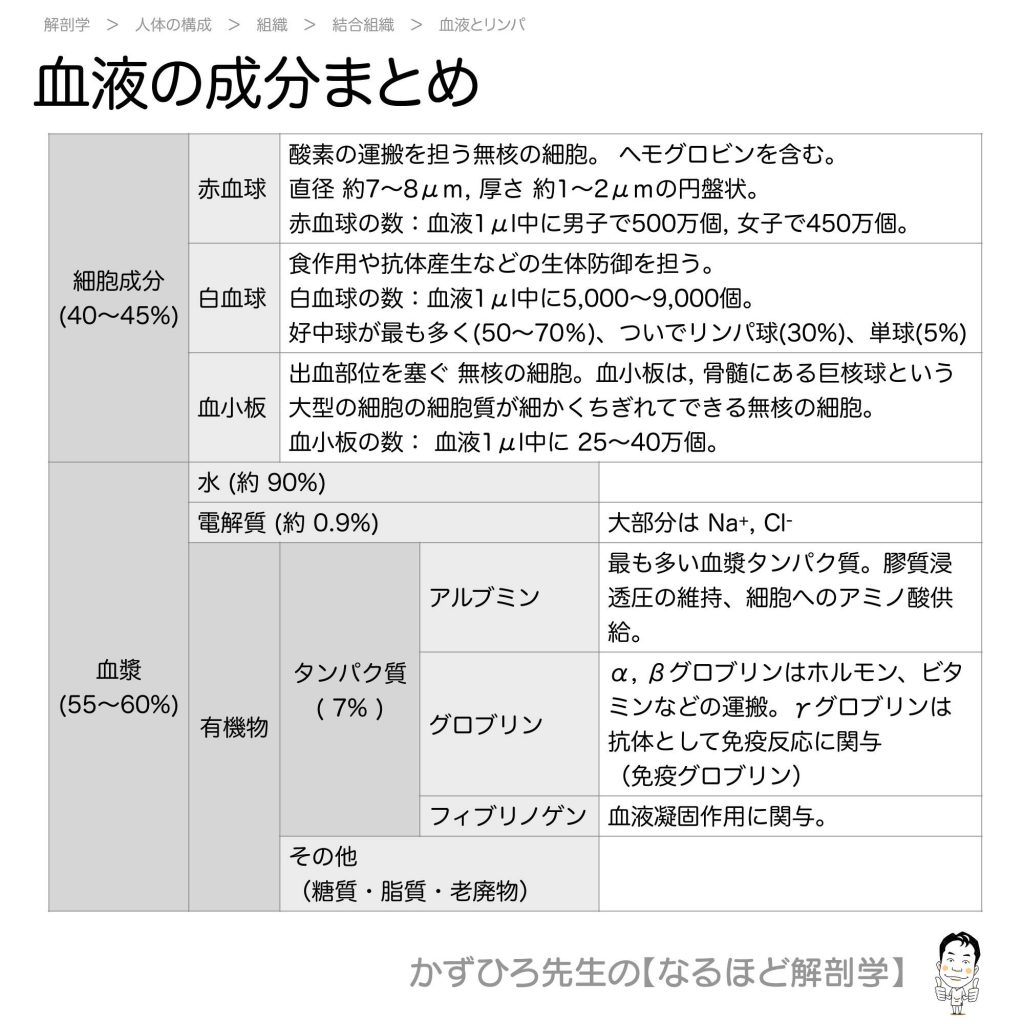 血液の成分まとめ - 完全攻略ガイド はじめに 血液は細胞成分(約40〜45%)と血漿(約55〜60%)から構成されています。様々な成分がそれぞれ重要な役割を担っています。今回は血液の成分について詳しく解説します。 詳しい解説 血液の構成 成分 割合 細胞... -