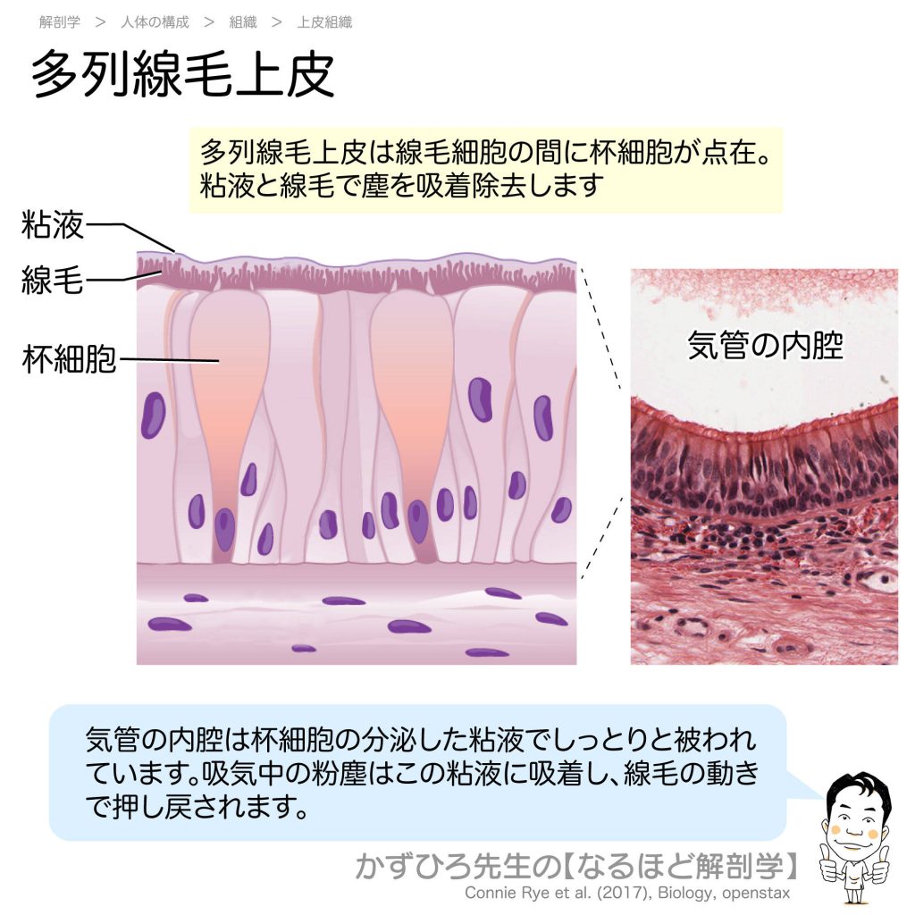 多列線毛上皮 - 完全攻略ガイド はじめに 多列線毛上皮は気道の粘膜を覆う特殊な上皮です。一見重層に見えますが、実際はすべての細胞が基底膜に接している単層上皮です。線毛と粘液で吸気中の異物を除去する重要な機能を持っています。今回は多列線毛上皮... -