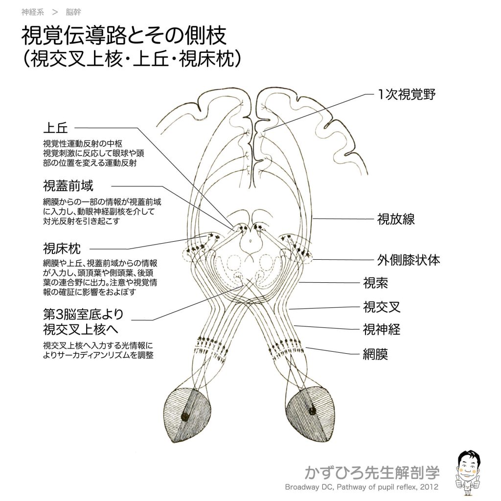 視覚伝導路とその側枝 - 完全攻略ガイド はじめに 視覚情報は網膜から一次視覚野へ送られるだけでなく、様々な構造にも分岐して送られます。視交叉上核(サーカディアンリズム)、上丘(視覚反射)、視蓋前域(対光反射)、視床枕(視覚の連合)など、各側...