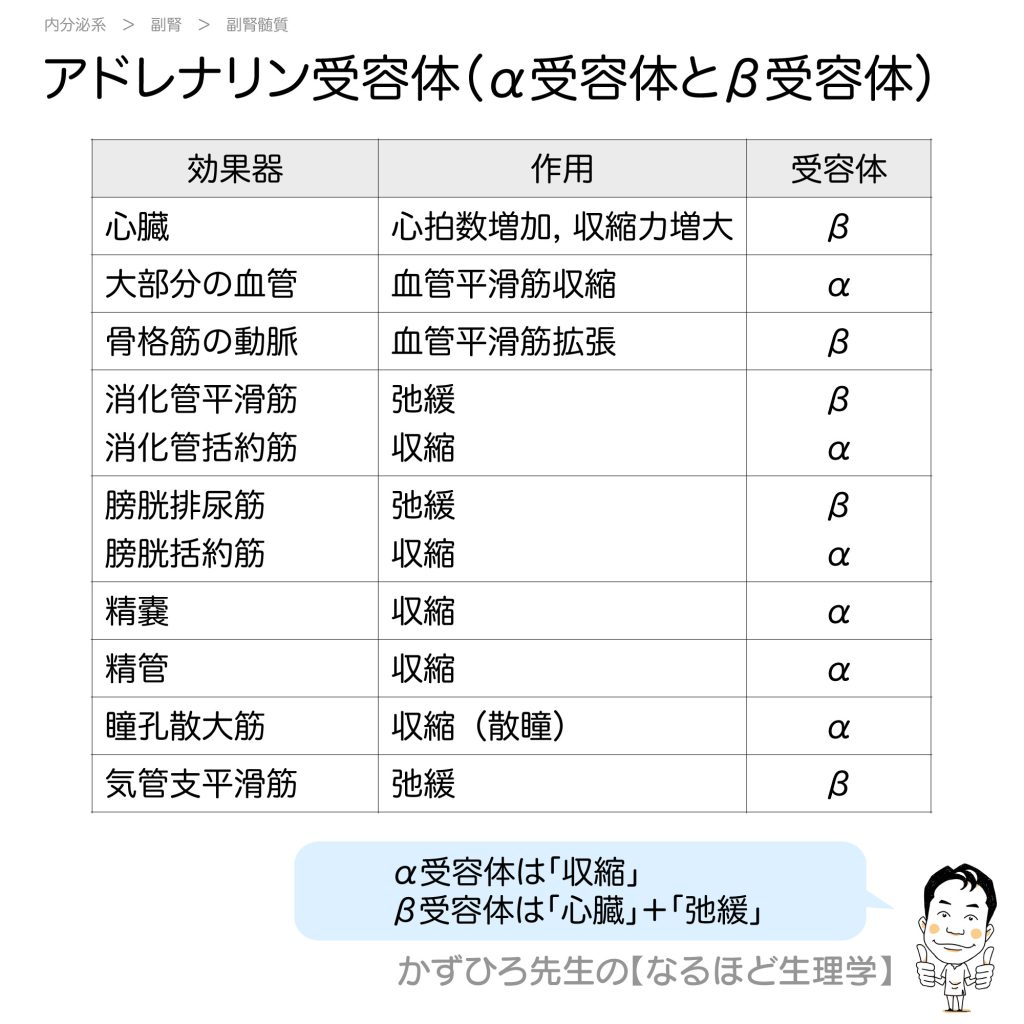 アドレナリン・ノルアドレナリンの作用の強さと受容体