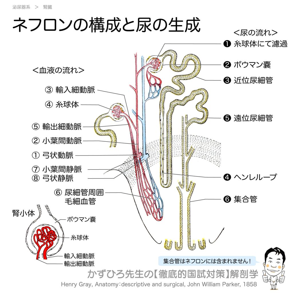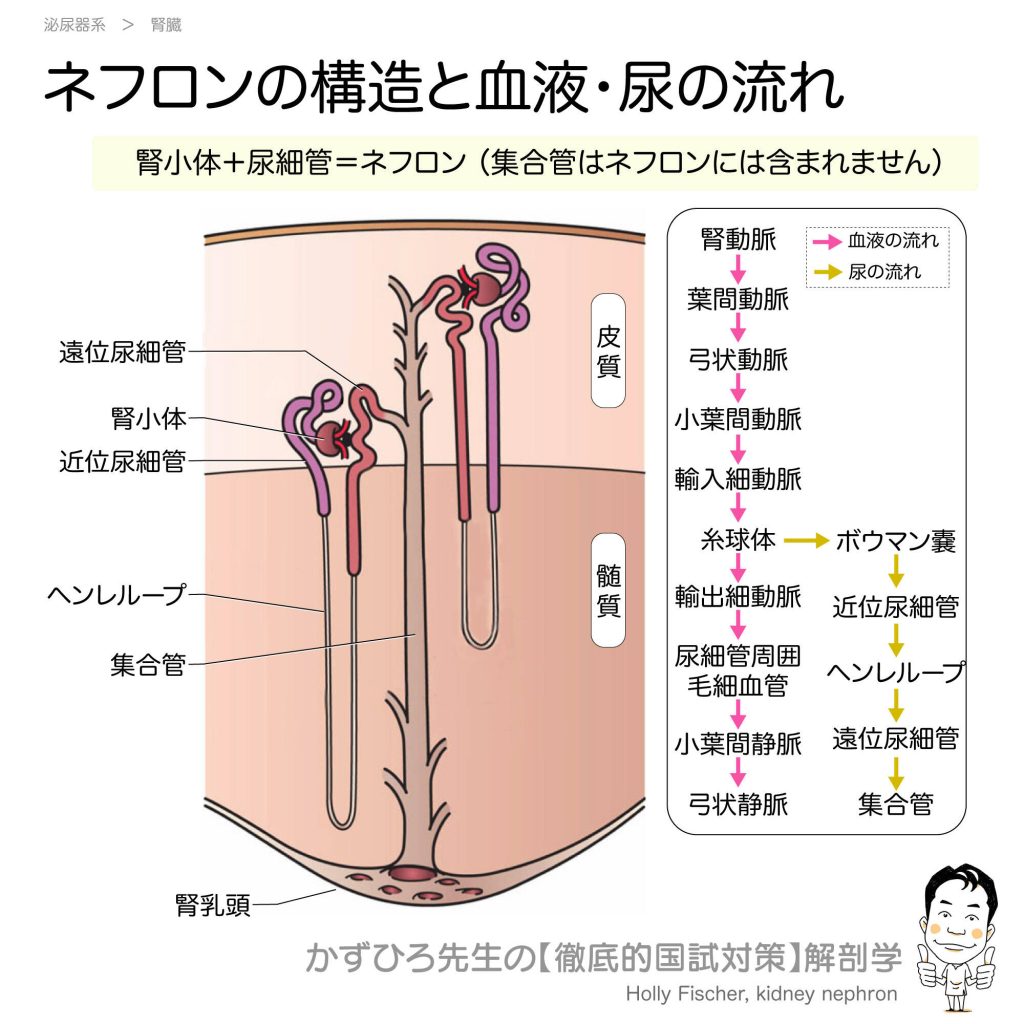 ネフロンの構造と血液・尿の流れ