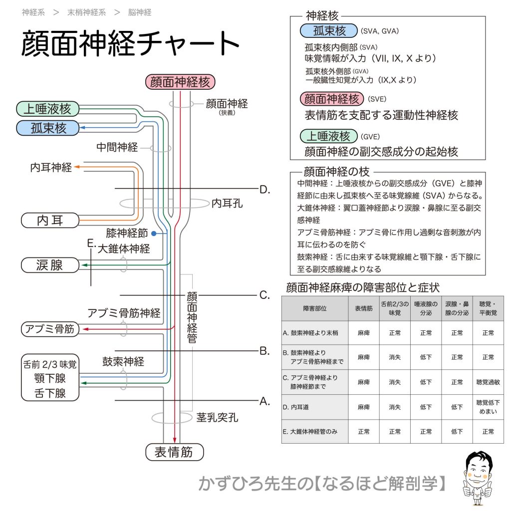 顔面神経チャート - 完全攻略ガイド はじめに 顔面神経(VII)は表情筋の運動(SVE)、舌前2/3の味覚(SVA)、涙腺・唾液腺への副交感(GVE)を担う複合神経です。茎乳突孔を通過し、麻痺の障害部位によって症状が異なります。 詳しい解説 顔面神経の神経... -