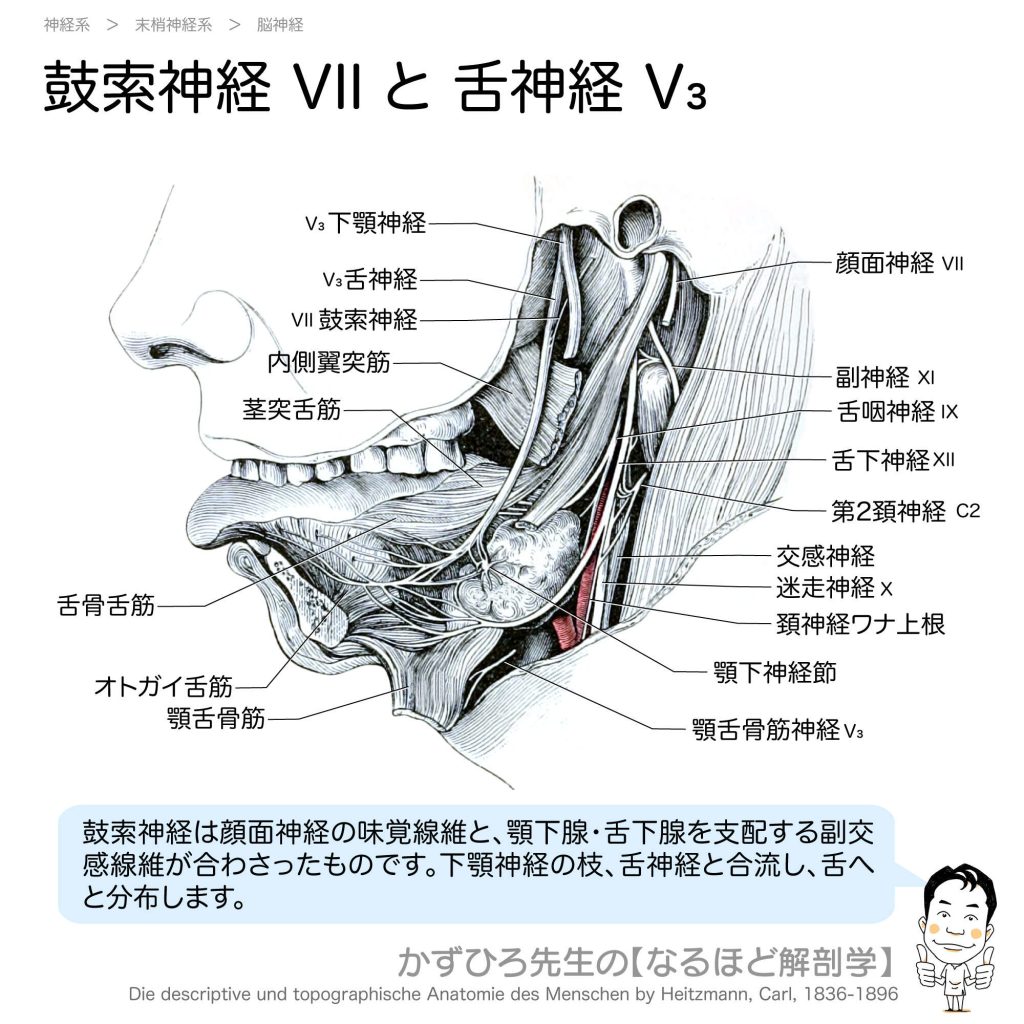 鼓索神経と舌神経 - 完全攻略ガイド はじめに 鼓索神経(VII)と舌神経(V3)は舌前2/3の支配において重要な関係にあります。舌神経は舌前2/3の一般感覚(知覚)を、鼓索神経は舌前2/3の味覚と顎下腺・舌下腺への副交感を担い、両者は途中で合流して舌へ分... -