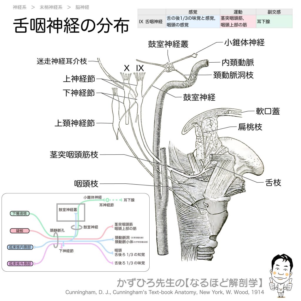 舌咽神経チャート - 完全攻略ガイド はじめに 舌咽神経(IX)は感覚・運動・副交感の混合神経で、頚静脈孔を通過します。舌後1/3の味覚・知覚、茎突咽頭筋の運動、耳下腺への副交感を担い、頚動脈洞反射による血圧調節にも関与します。 詳しい解説 舌咽神... -